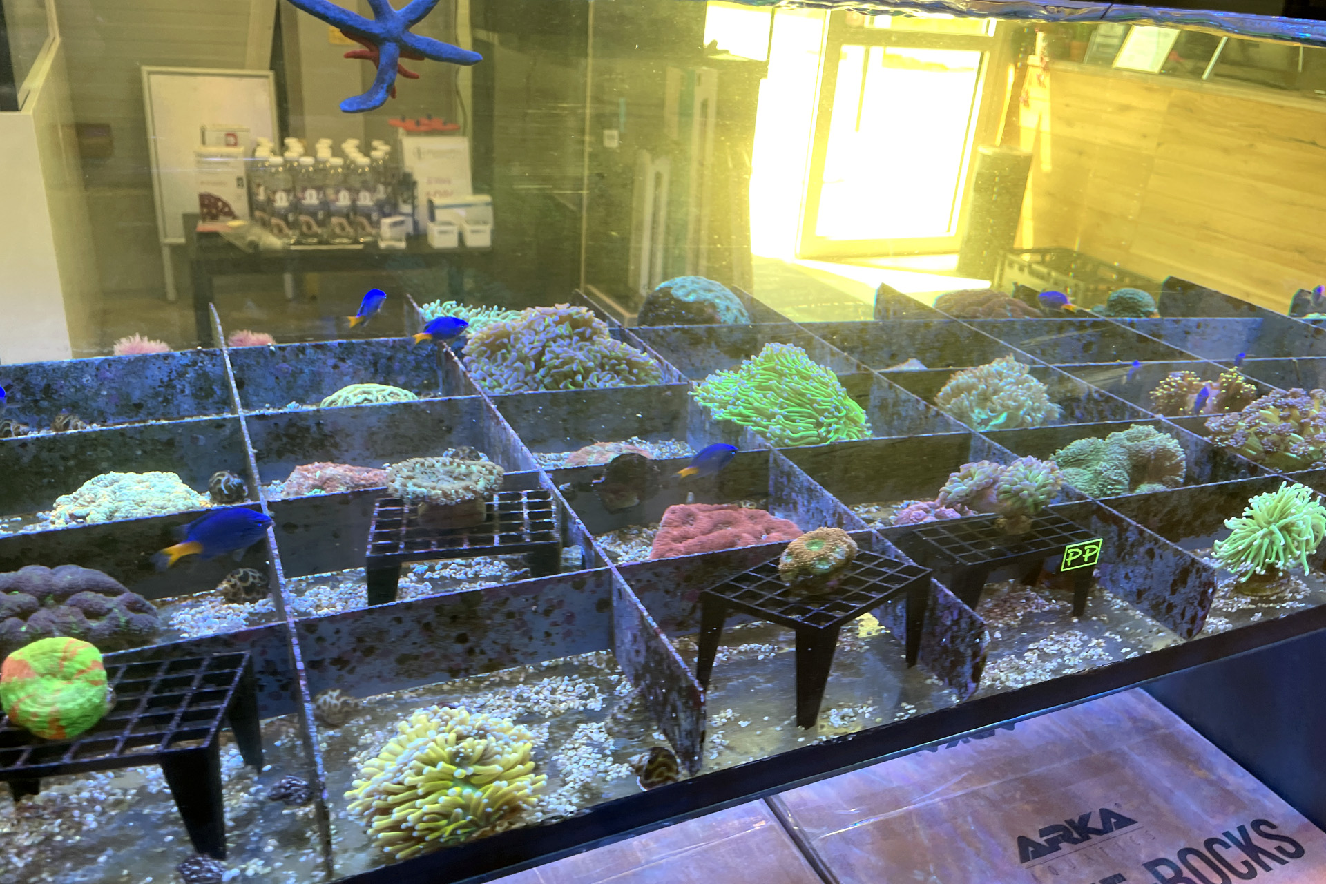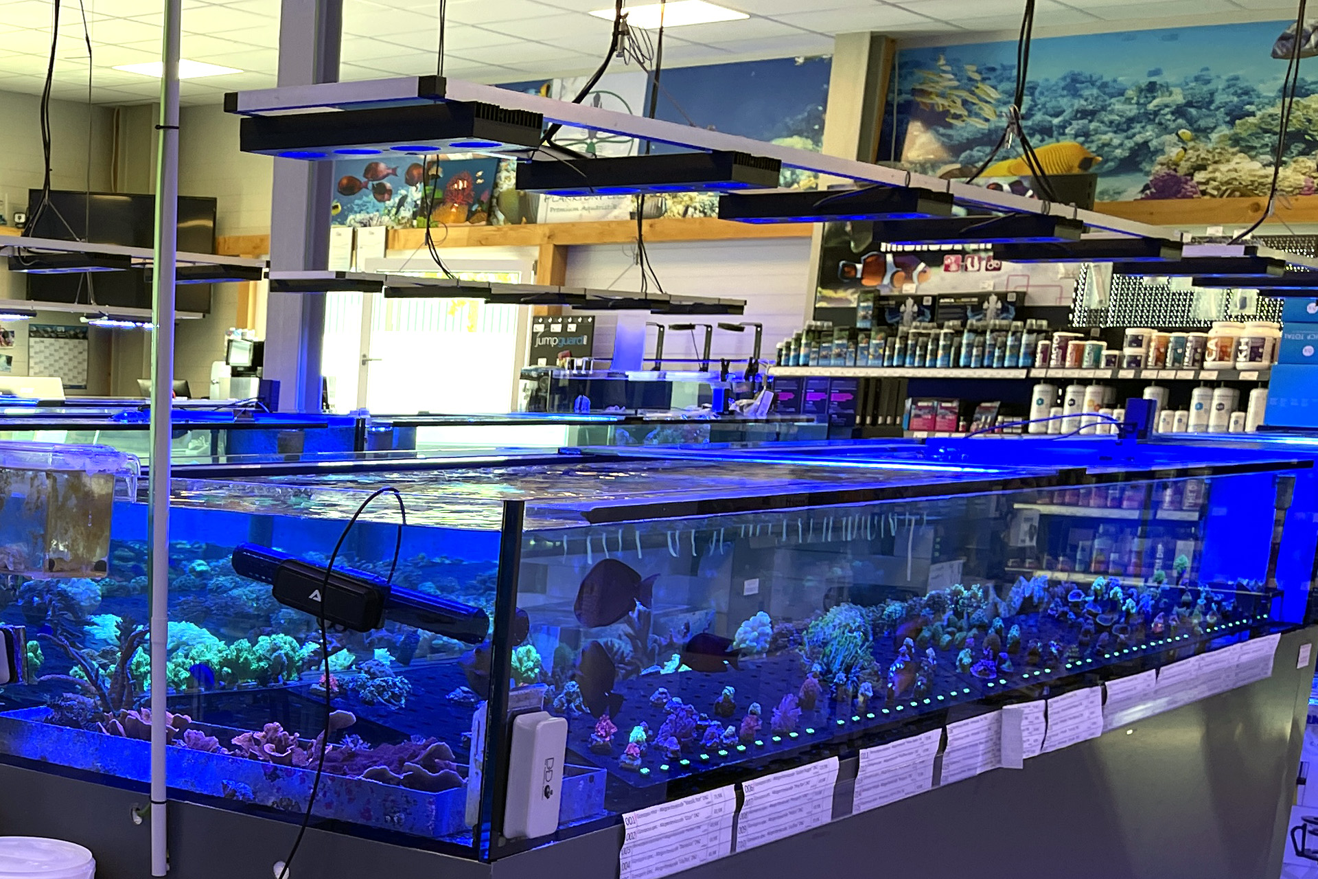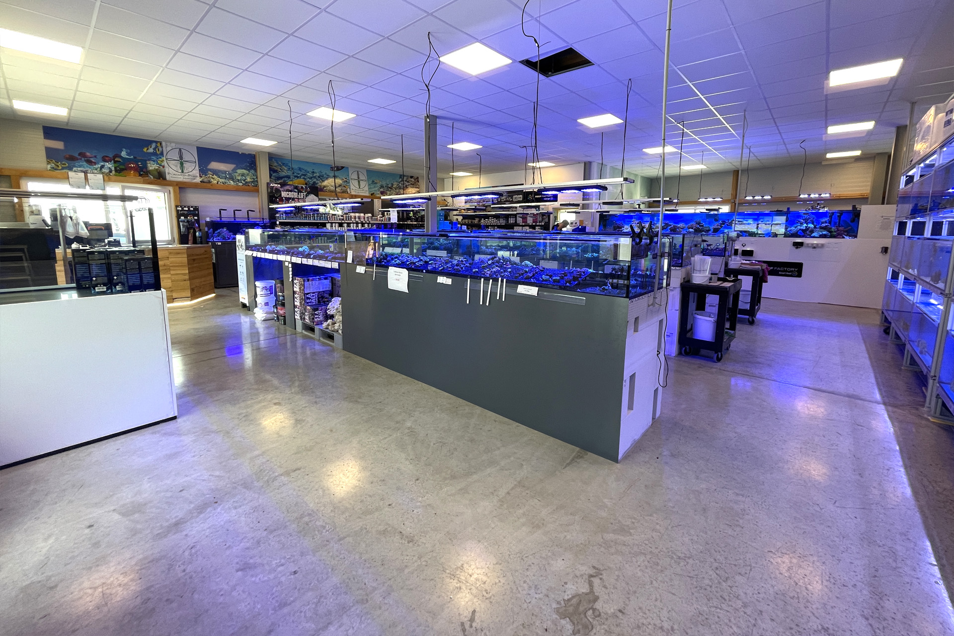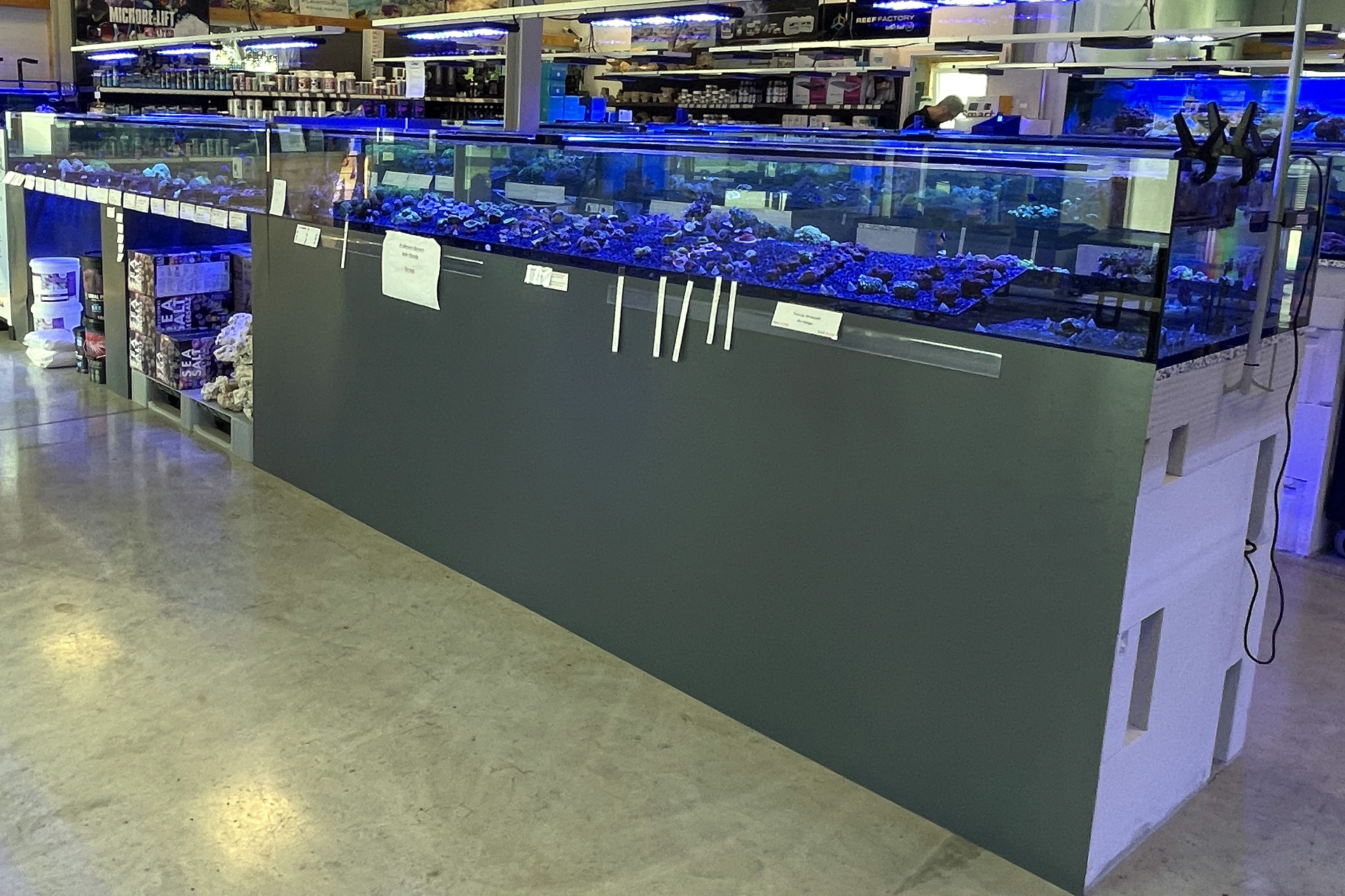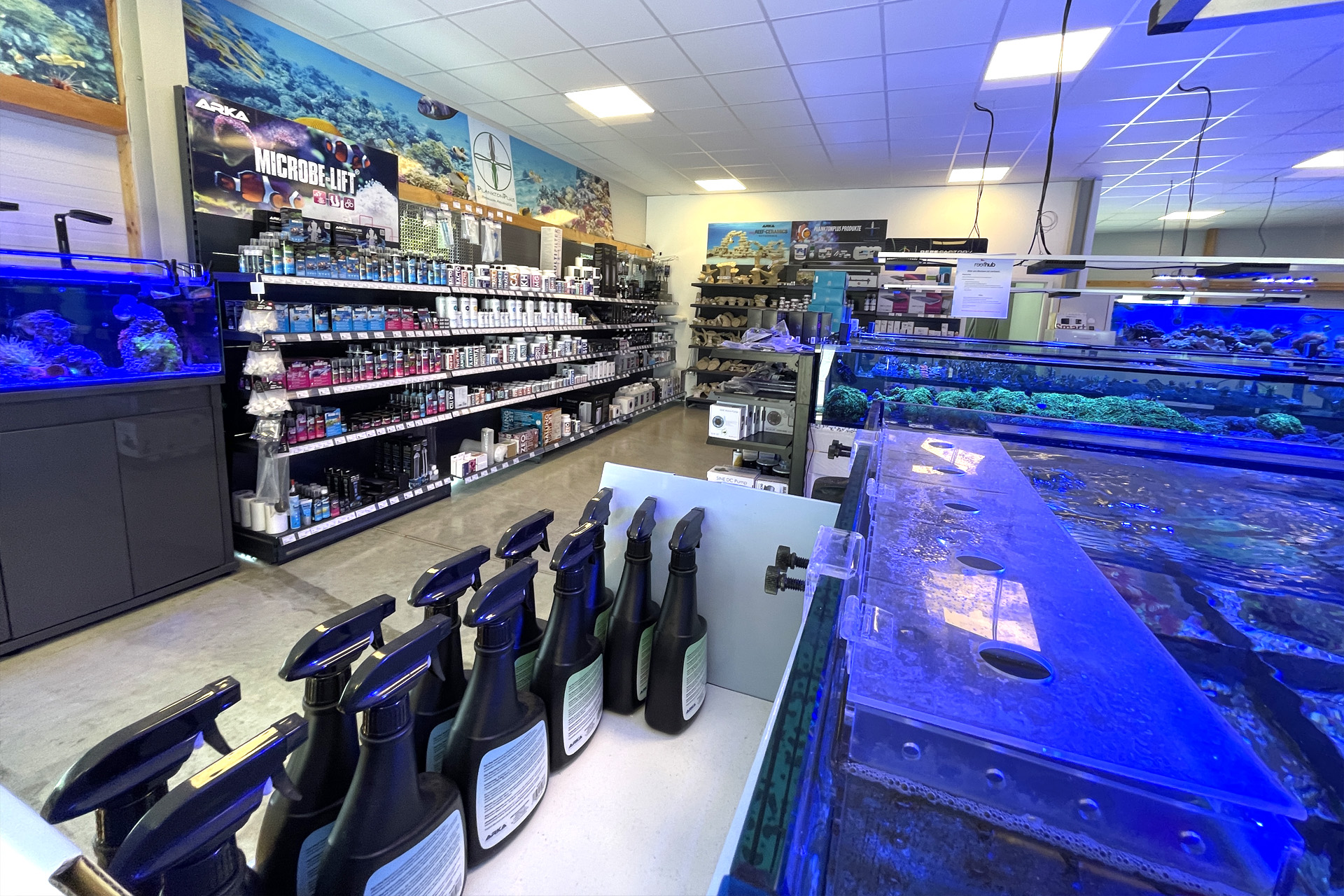 finale Umzug wird. Denn dann werden endlich Fachgeschäft und Versandhandel um selben Platz sein. Auf Einladung von Michael Schinhammer hatten wir am 10 Mai noch ein letztes Mal die Chance einen Blick in die alten Räume in Neumarkt werfen zu können. Ein letzter Blick in den Verkaufsraum, das 5-Meter-Becken und die Verkaufsanlagen, bevor alles nach Hohenburg umzieht. Parallel war ja die Herrichtung der neuen Räume schon in vollem Gange. Alles was neu zu bauen war oder nicht unbedingt für das bestehende Geschäft benötigt wurde, war bereits mitten im Umzug. Vielen Dank auf jeden Fall an Michael, dass er sich die Zeit genommen hat für einen sehr angenehmen Aufenthalt bei PlanktonPlus und für den Gedankenaustausch zu den bestehenden und der Gestaltung der neuen Räume. Hier jetzt für euch noch einmal letzte Eindrücke aus den alten Räumen Im Zwiesel 1 in Neumarkt. Imk Zentrum stehr die große Korallenanlage. An der großen Fensterseite einige Systemaquarien zur Ansicht. An den gegenüberliegenden Seiten zum Eingang befand sich zum einen die Fischanlage und zum anderen das große 5-Meter-Becken. Wenn man vom Eingang am Verkaufstresen vorbei geht, kann man sich einen guten Überblick über das Trockensortiment verschaffen.