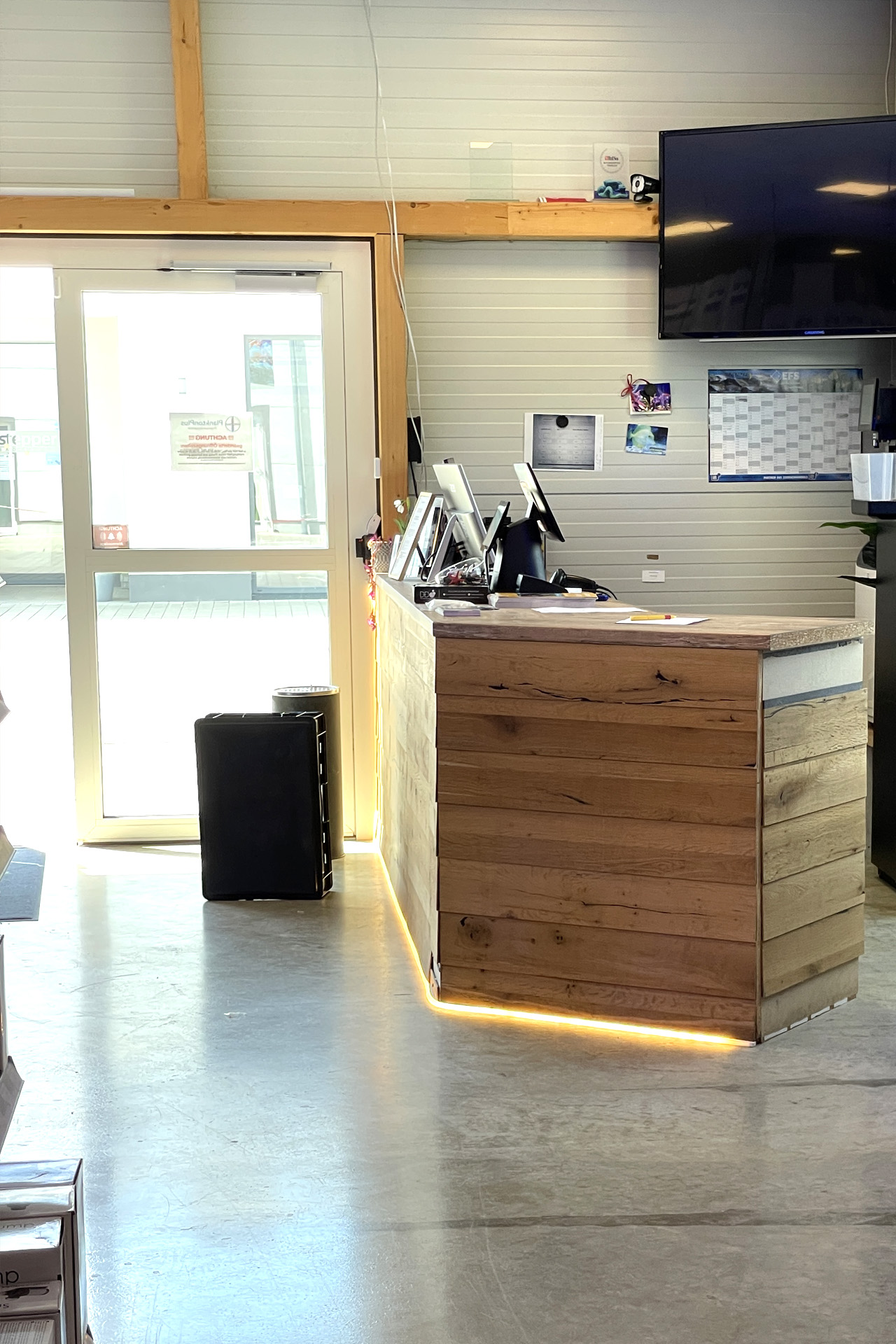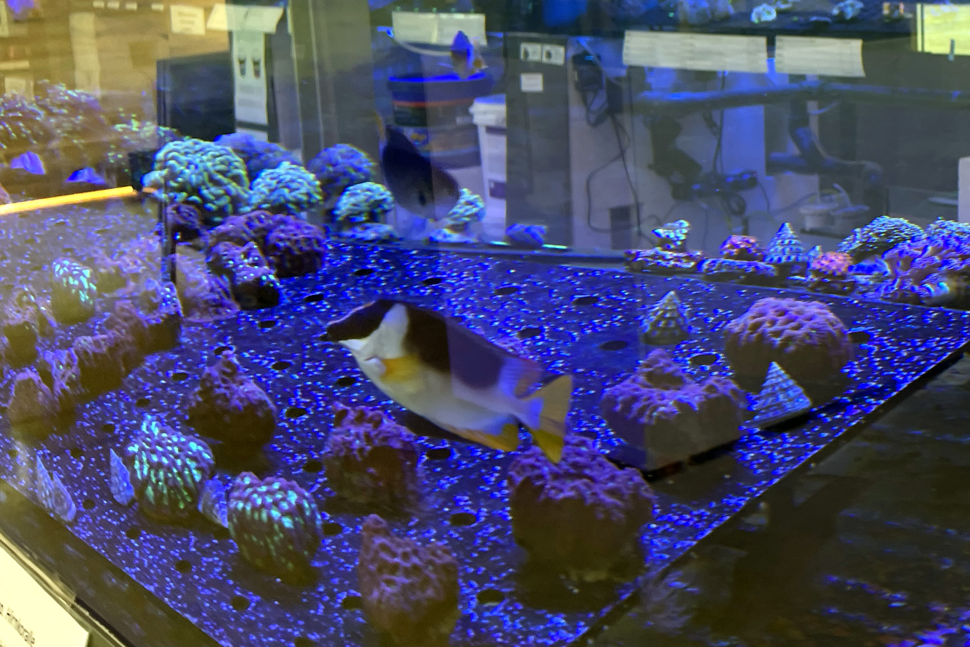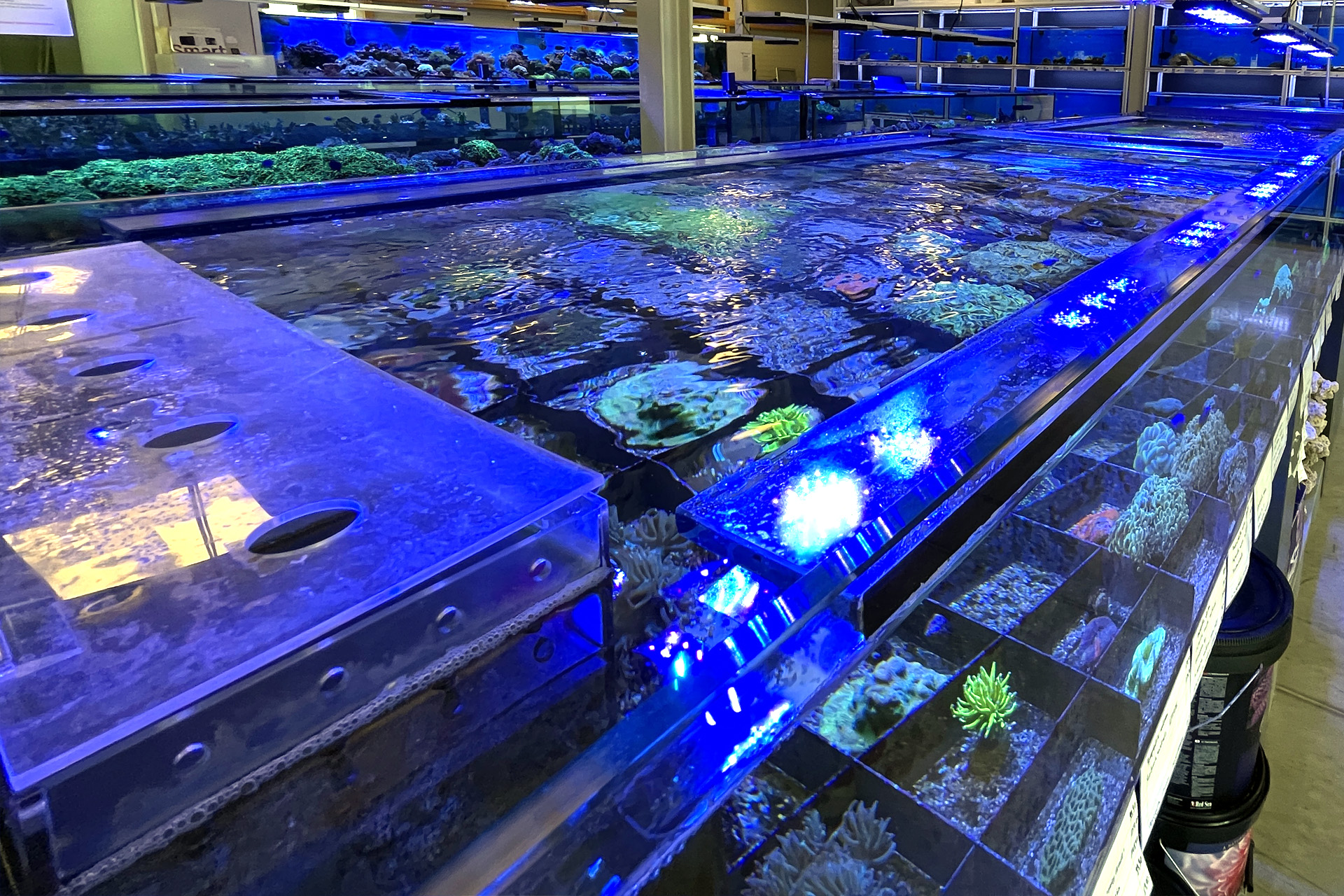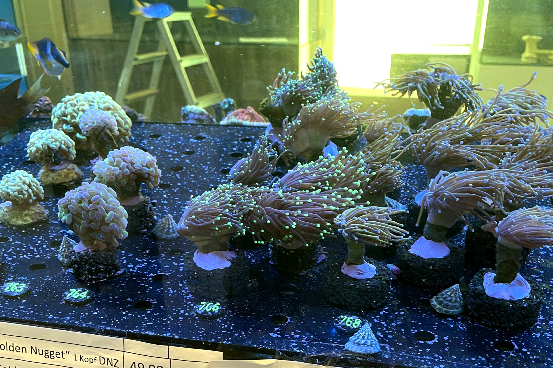 finale Umzug wird. Denn dann werden endlich Fachgeschäft und Versandhandel um selben Platz sein. Auf Einladung von Michael Schinhammer hatten wir am 10 Mai noch ein letztes Mal die Chance einen Blick in die alten Räume in Neumarkt werfen zu können. Ein letzter Blick in den Verkaufsraum, das 5-Meter-Becken und die Verkaufsanlagen, bevor alles nach Hohenburg umzieht. Parallel war ja die Herrichtung der neuen Räume schon in vollem Gange. Alles was neu zu bauen war oder nicht unbedingt für das bestehende Geschäft benötigt wurde, war bereits mitten im Umzug. Vielen Dank auf jeden Fall an Michael, dass er sich die Zeit genommen hat für einen sehr angenehmen Aufenthalt bei PlanktonPlus und für den Gedankenaustausch zu den bestehenden und der Gestaltung der neuen Räume. Hier jetzt für euch noch einmal letzte Eindrücke aus den alten Räumen Im Zwiesel 1 in Neumarkt. Imk Zentrum stehr die große Korallenanlage. An der großen Fensterseite einige Systemaquarien zur Ansicht. An den gegenüberliegenden Seiten zum Eingang befand sich zum einen die Fischanlage und zum anderen das große 5-Meter-Becken. Wenn man vom Eingang am Verkaufstresen vorbei geht, kann man sich einen guten Überblick über das Trockensortiment verschaffen.