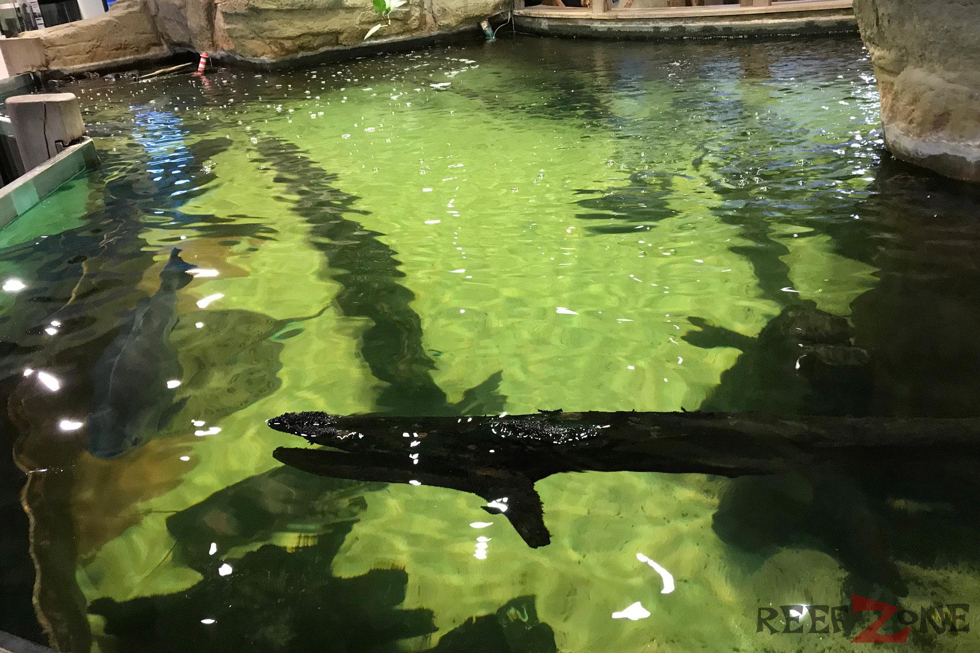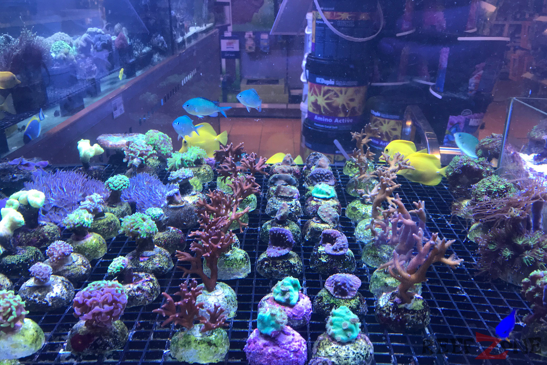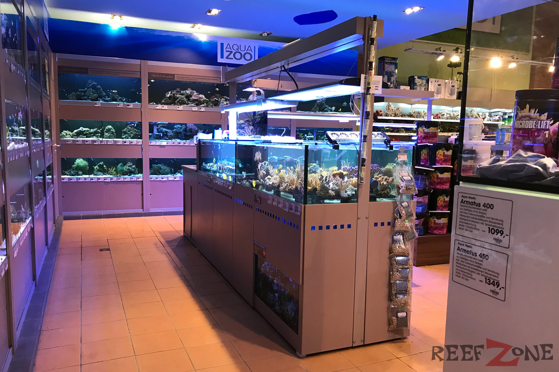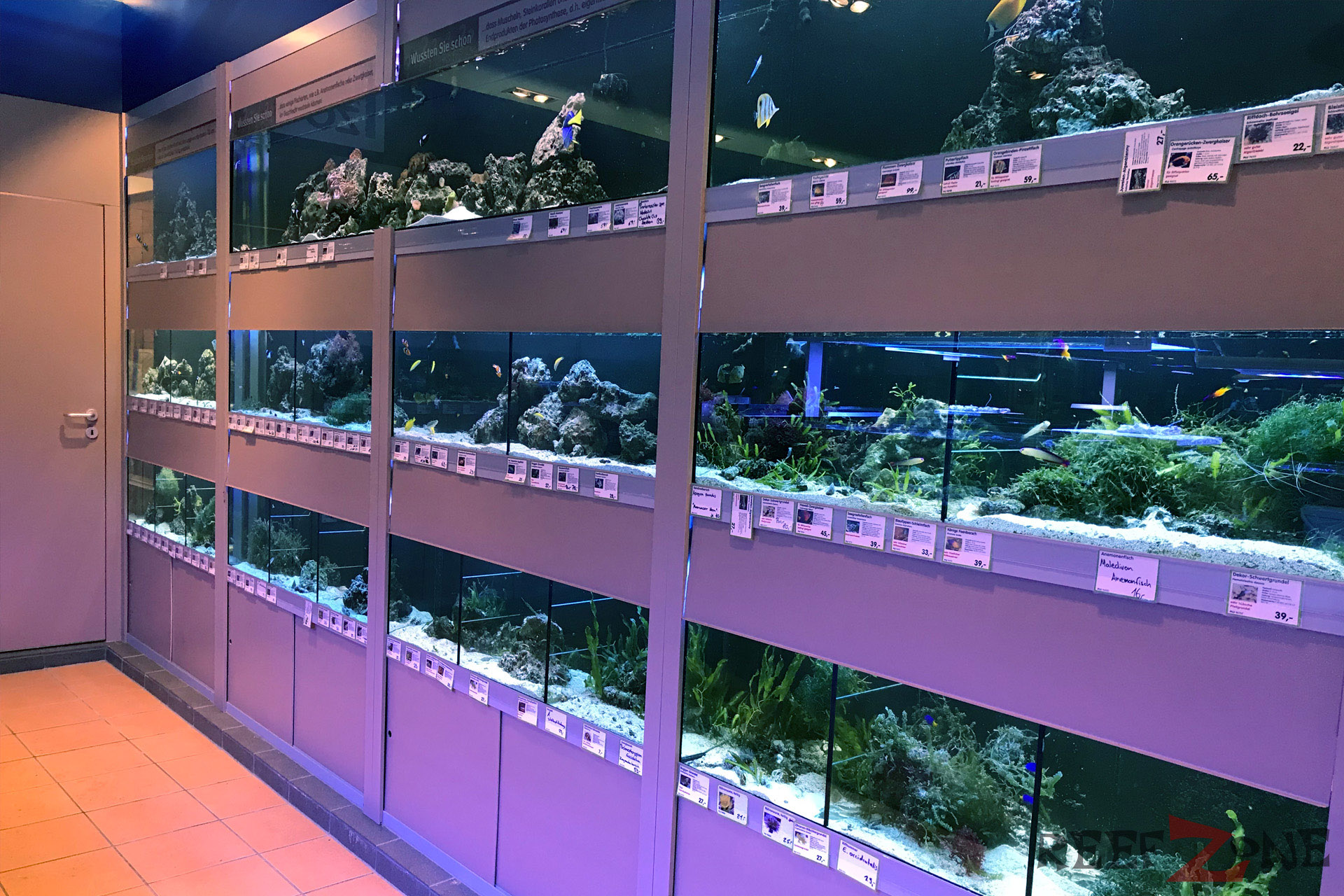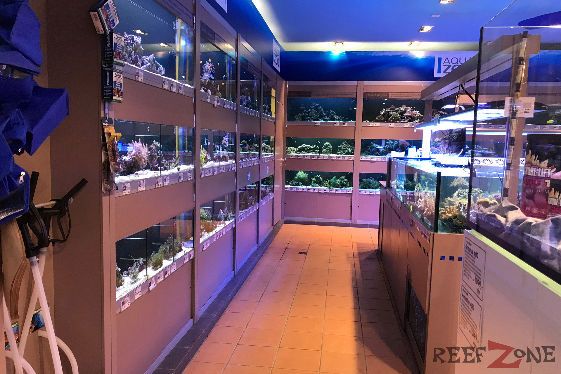 Aktuell befindet sich ab Platz der ehemaligen Meerwasserabteilung eine Aquarienausstellung. Dafür gehen jetzt Meerwasser- und Süßwasserabteilung förmlich ineinander über. Passt irgendwie auch besser. Zahlreiche Becken mit Riffbewohnern sind jetzt in L-Form entlang der Wand aufgebaut. Daneben stehen Korallenanlagen unter denen sich Filterbecken mit Lebendgestein befinden. Zahlreiches Zubehör, künstliches Riffgestein, totes Riffgestein und Technik gehören zum Sortiment. In den Korallenbecke schwimmen zahlreiche Fische, darunter Doktoren und Riffbarsche. Auch an einer Tankstelle für Meerwasser fehlt es hier nicht.