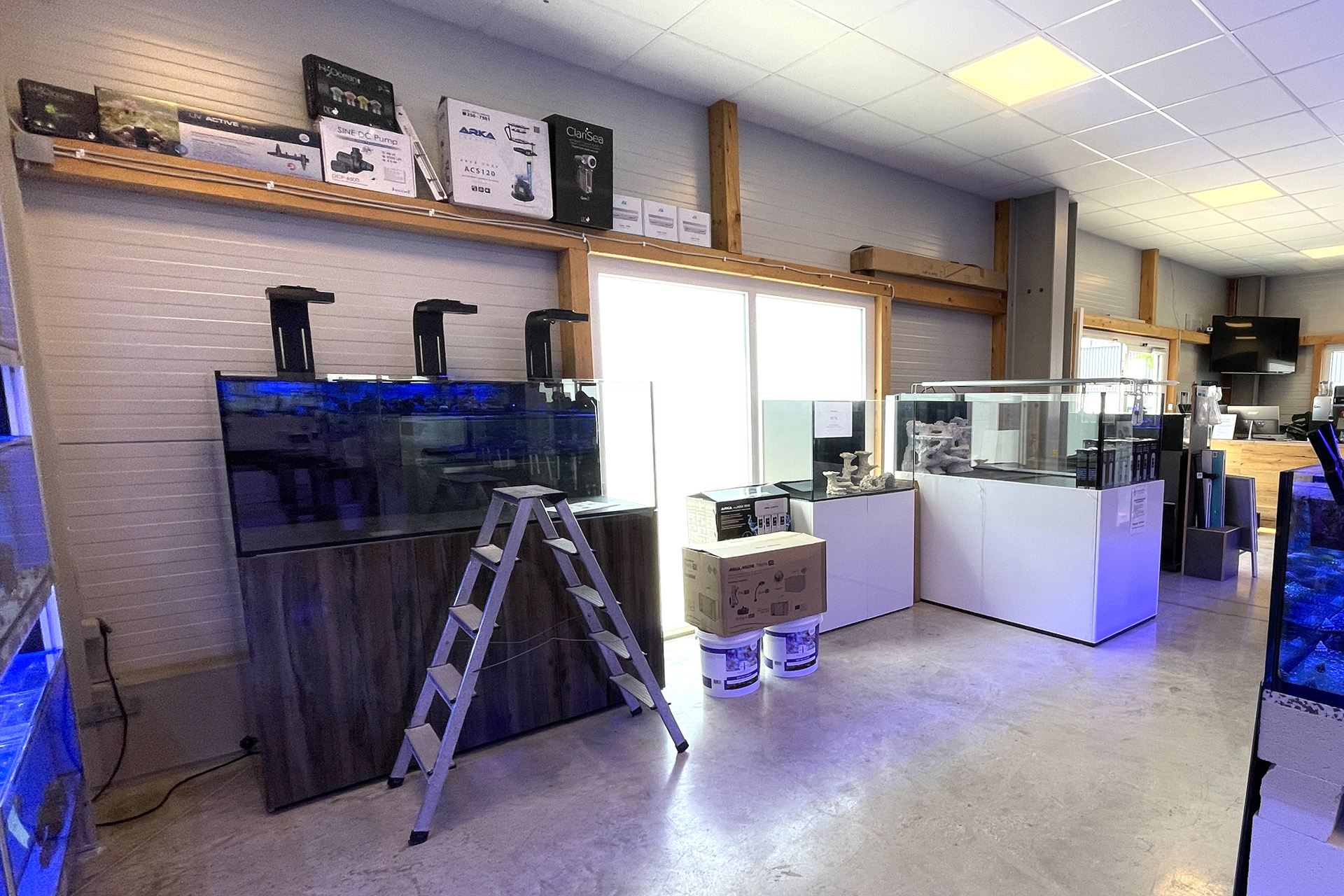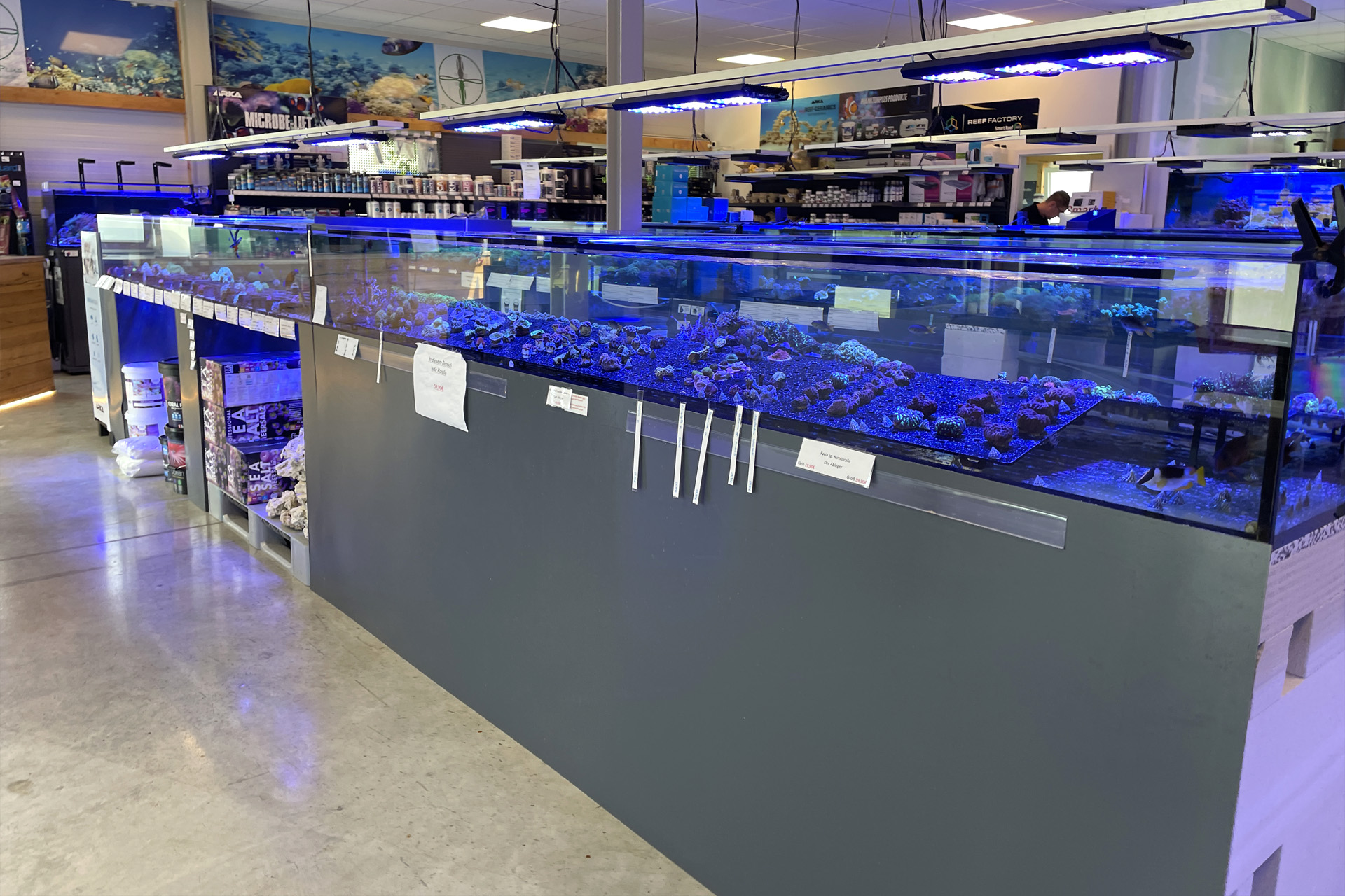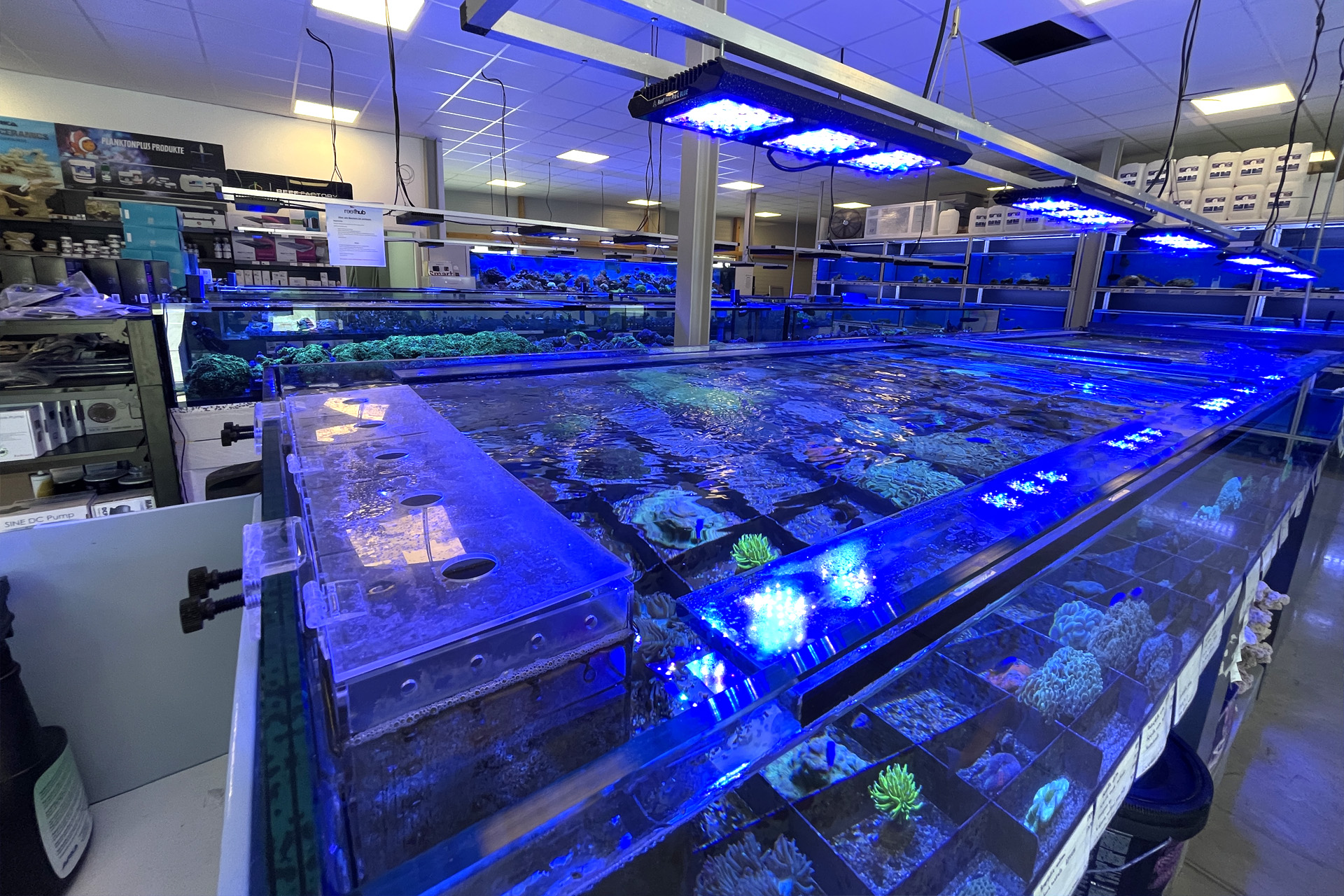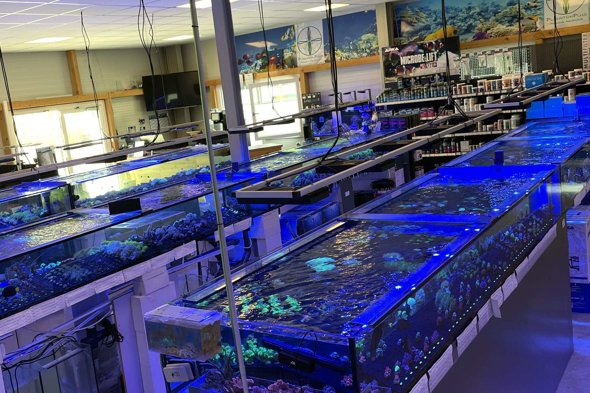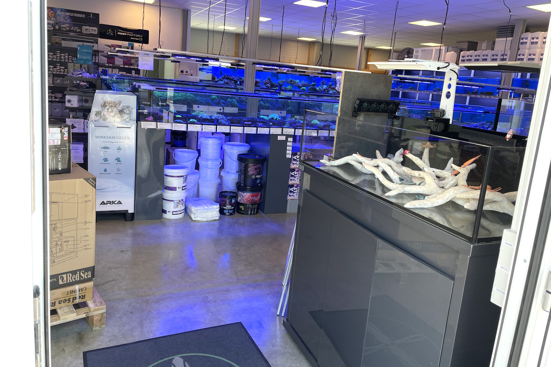 finale Umzug wird. Denn dann werden endlich Fachgeschäft und Versandhandel um selben Platz sein. Auf Einladung von Michael Schinhammer hatten wir am 10 Mai noch ein letztes Mal die Chance einen Blick in die alten Räume in Neumarkt werfen zu können. Ein letzter Blick in den Verkaufsraum, das 5-Meter-Becken und die Verkaufsanlagen, bevor alles nach Hohenburg umzieht. Parallel war ja die Herrichtung der neuen Räume schon in vollem Gange. Alles was neu zu bauen war oder nicht unbedingt für das bestehende Geschäft benötigt wurde, war bereits mitten im Umzug. Vielen Dank auf jeden Fall an Michael, dass er sich die Zeit genommen hat für einen sehr angenehmen Aufenthalt bei PlanktonPlus und für den Gedankenaustausch zu den bestehenden und der Gestaltung der neuen Räume. Hier jetzt für euch noch einmal letzte Eindrücke aus den alten Räumen Im Zwiesel 1 in Neumarkt. Imk Zentrum stehr die große Korallenanlage. An der großen Fensterseite einige Systemaquarien zur Ansicht. An den gegenüberliegenden Seiten zum Eingang befand sich zum einen die Fischanlage und zum anderen das große 5-Meter-Becken. Wenn man vom Eingang am Verkaufstresen vorbei geht, kann man sich einen guten Überblick über das Trockensortiment verschaffen.