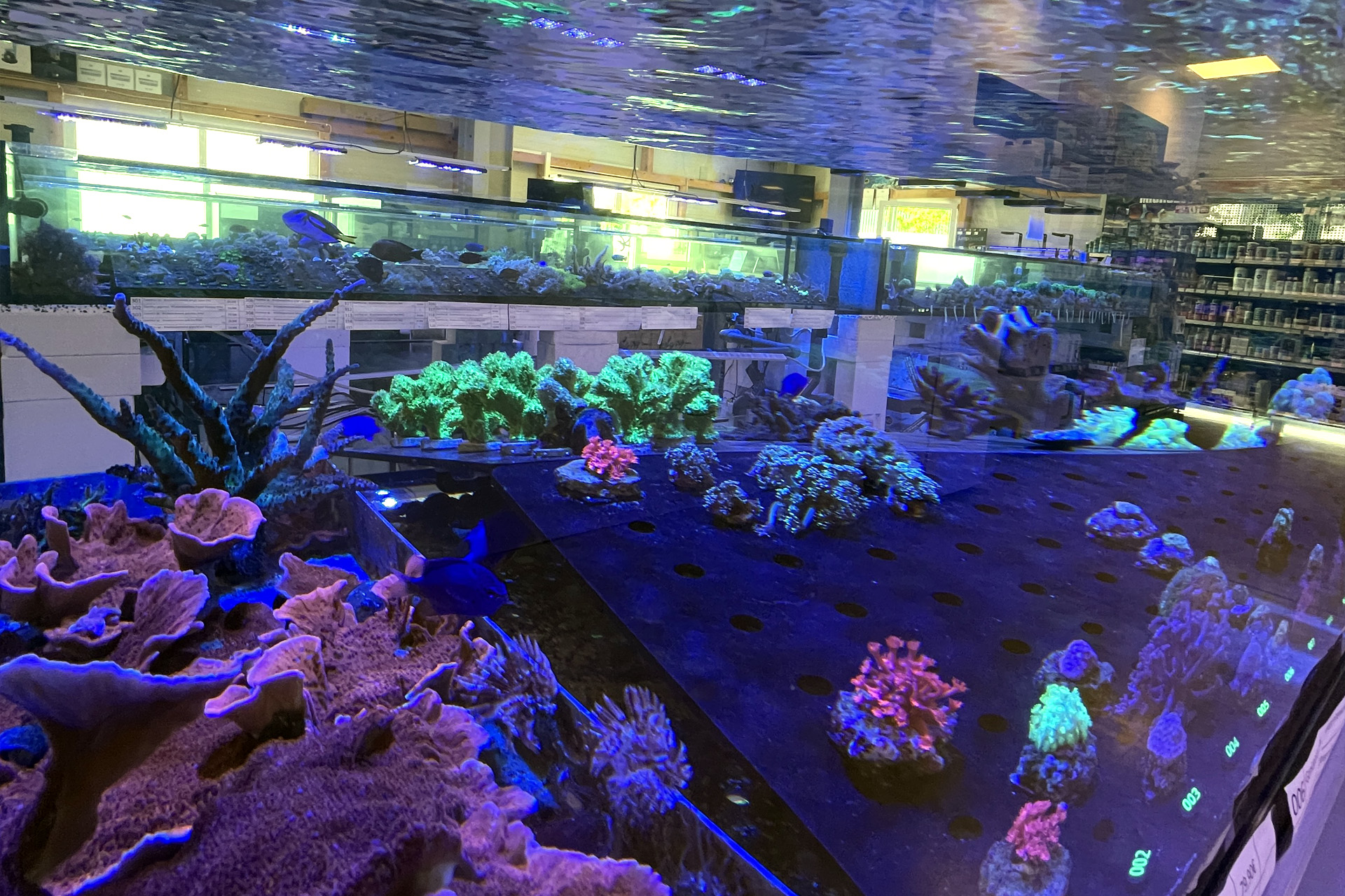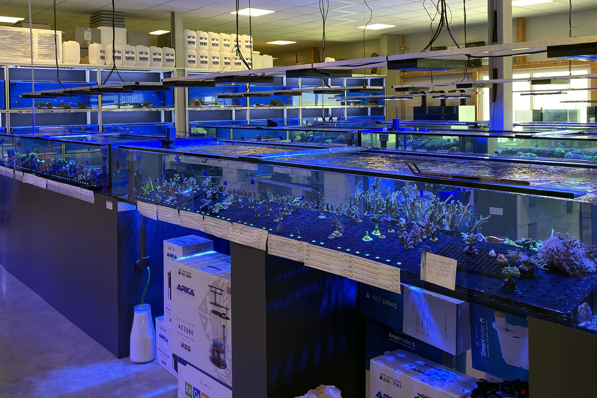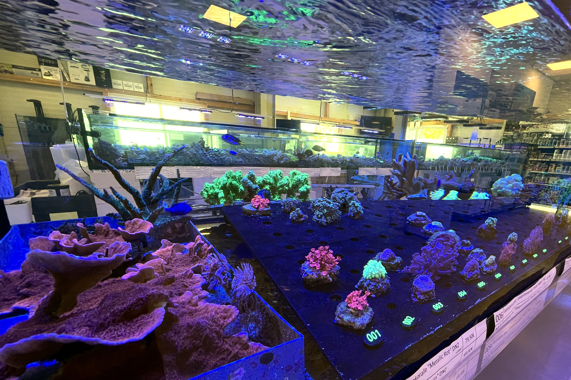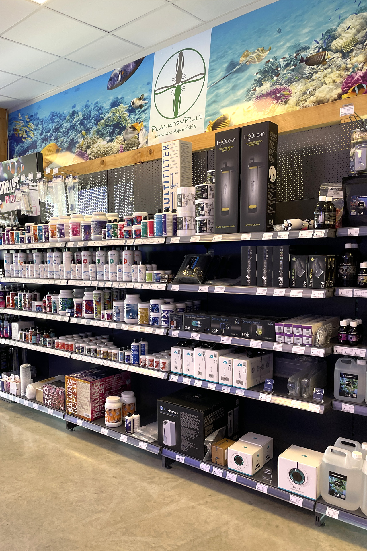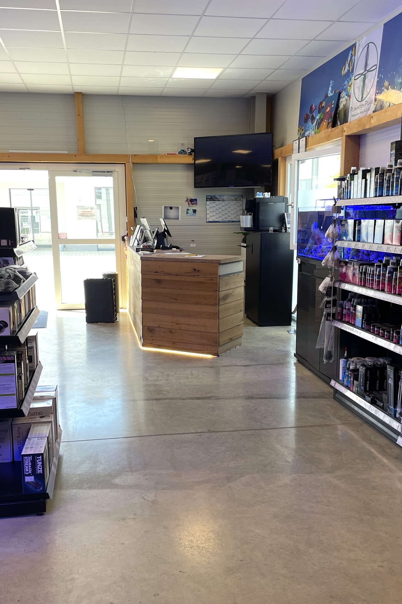 finale Umzug wird. Denn dann werden endlich Fachgeschäft und Versandhandel um selben Platz sein. Auf Einladung von Michael Schinhammer hatten wir am 10 Mai noch ein letztes Mal die Chance einen Blick in die alten Räume in Neumarkt werfen zu können. Ein letzter Blick in den Verkaufsraum, das 5-Meter-Becken und die Verkaufsanlagen, bevor alles nach Hohenburg umzieht. Parallel war ja die Herrichtung der neuen Räume schon in vollem Gange. Alles was neu zu bauen war oder nicht unbedingt für das bestehende Geschäft benötigt wurde, war bereits mitten im Umzug. Vielen Dank auf jeden Fall an Michael, dass er sich die Zeit genommen hat für einen sehr angenehmen Aufenthalt bei PlanktonPlus und für den Gedankenaustausch zu den bestehenden und der Gestaltung der neuen Räume. Hier jetzt für euch noch einmal letzte Eindrücke aus den alten Räumen Im Zwiesel 1 in Neumarkt. Imk Zentrum stehr die große Korallenanlage. An der großen Fensterseite einige Systemaquarien zur Ansicht. An den gegenüberliegenden Seiten zum Eingang befand sich zum einen die Fischanlage und zum anderen das große 5-Meter-Becken. Wenn man vom Eingang am Verkaufstresen vorbei geht, kann man sich einen guten Überblick über das Trockensortiment verschaffen.