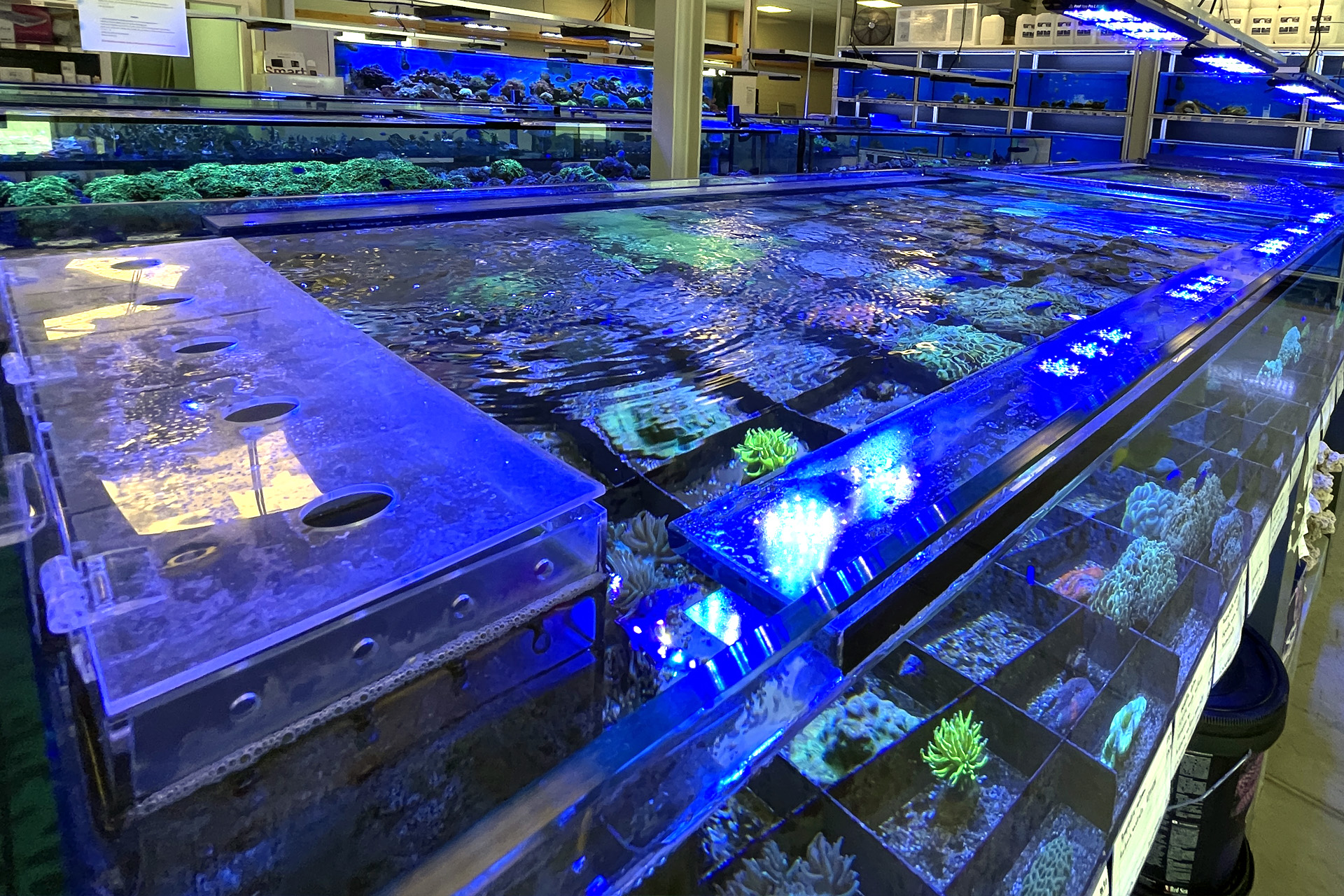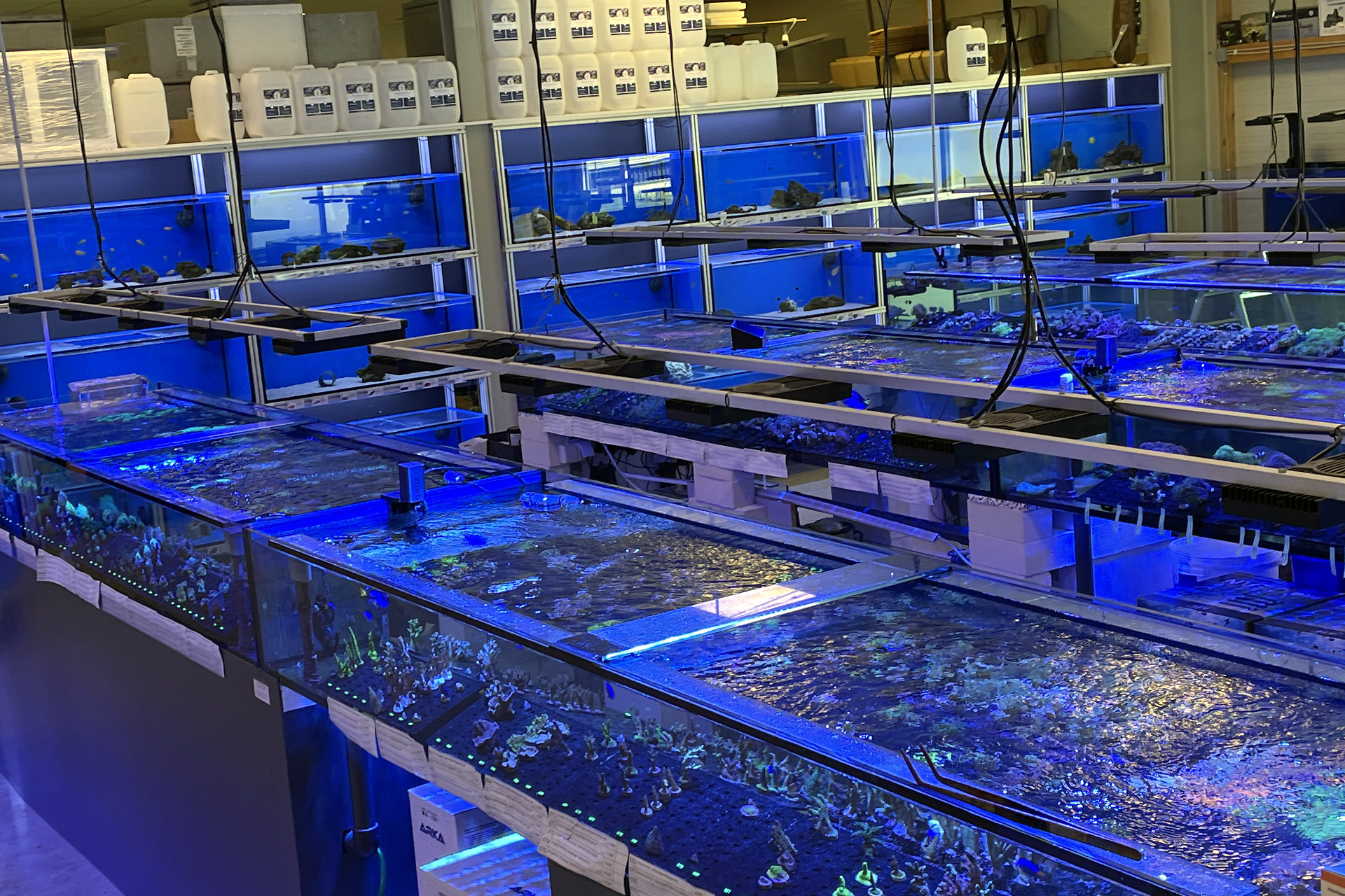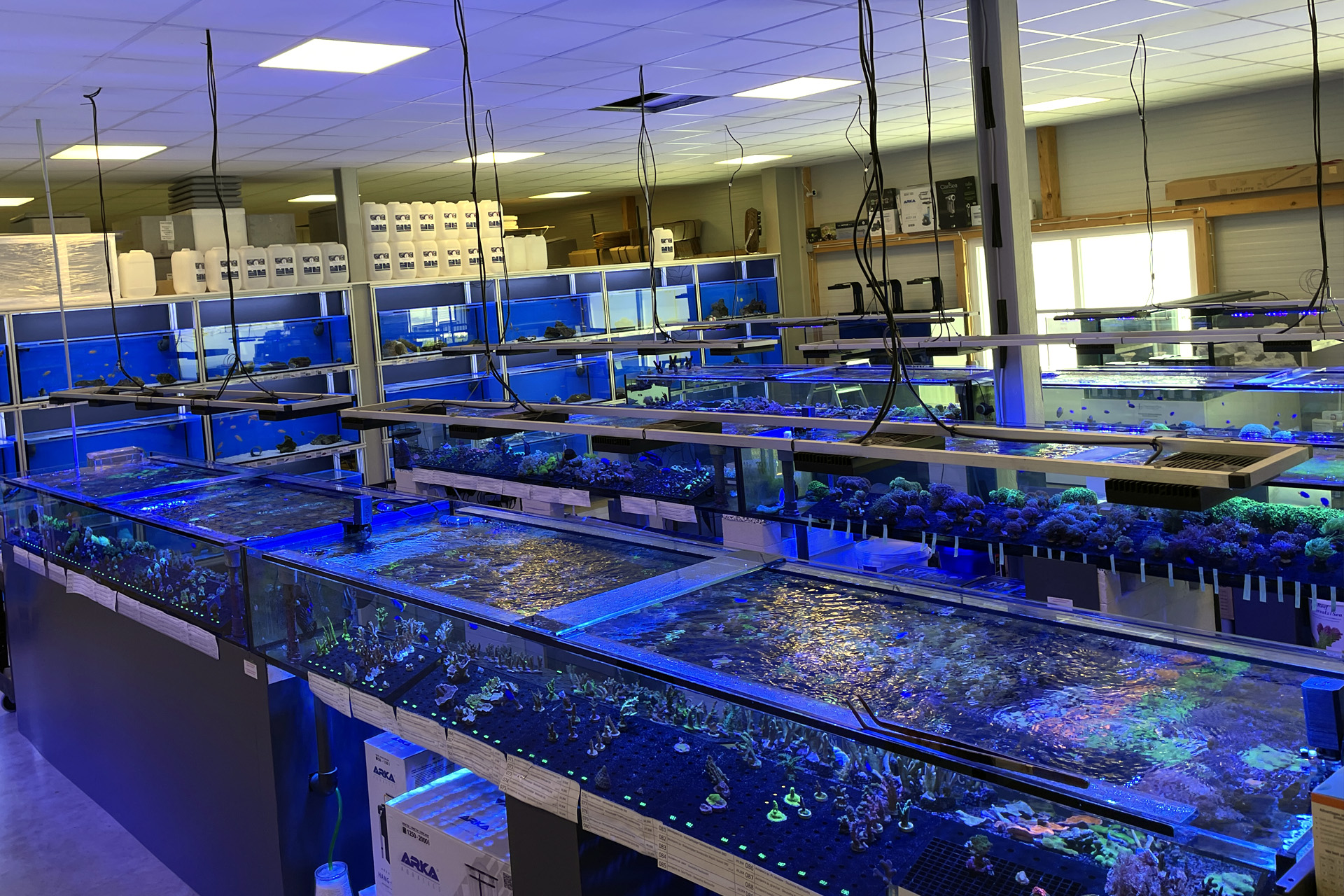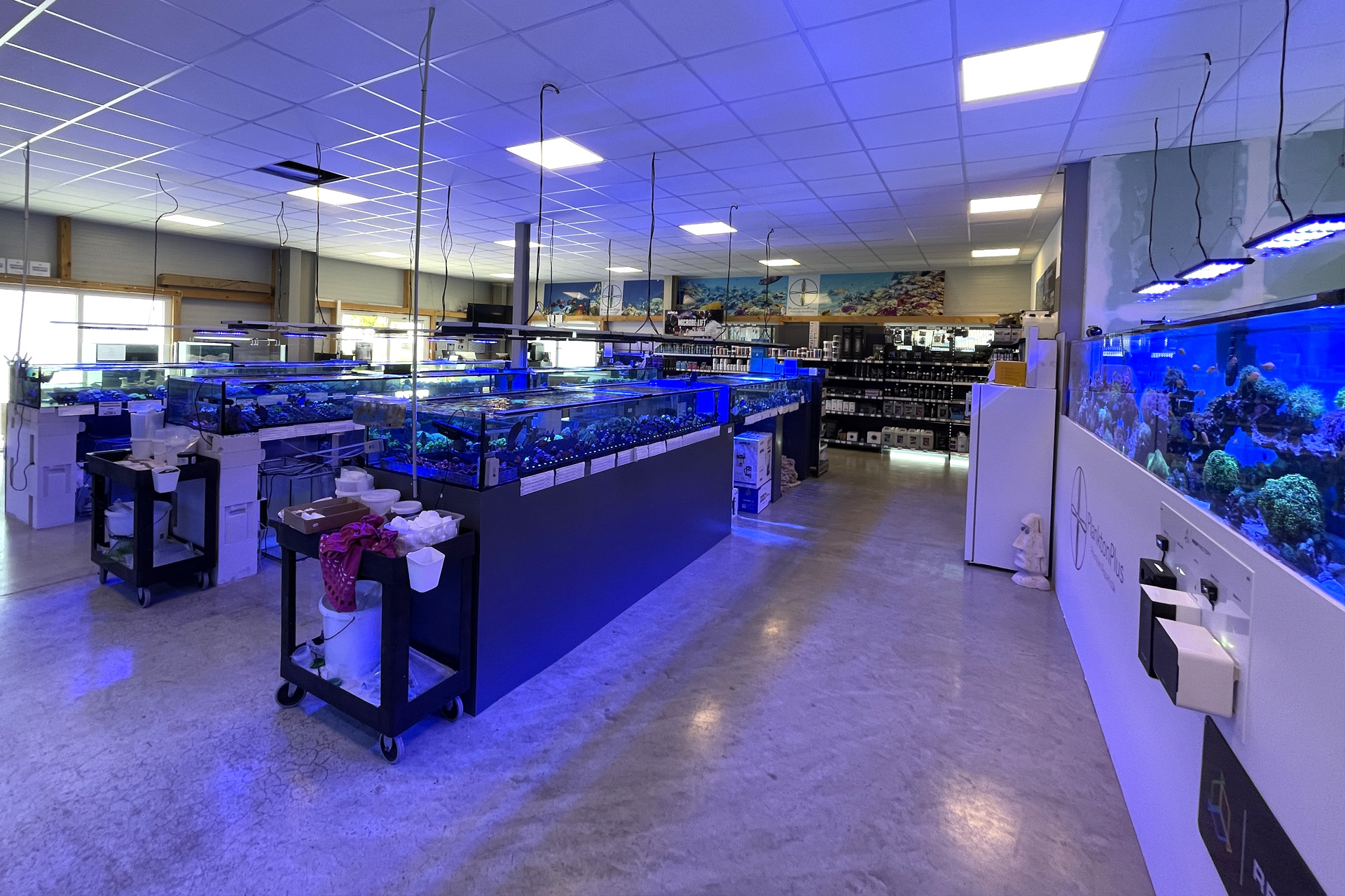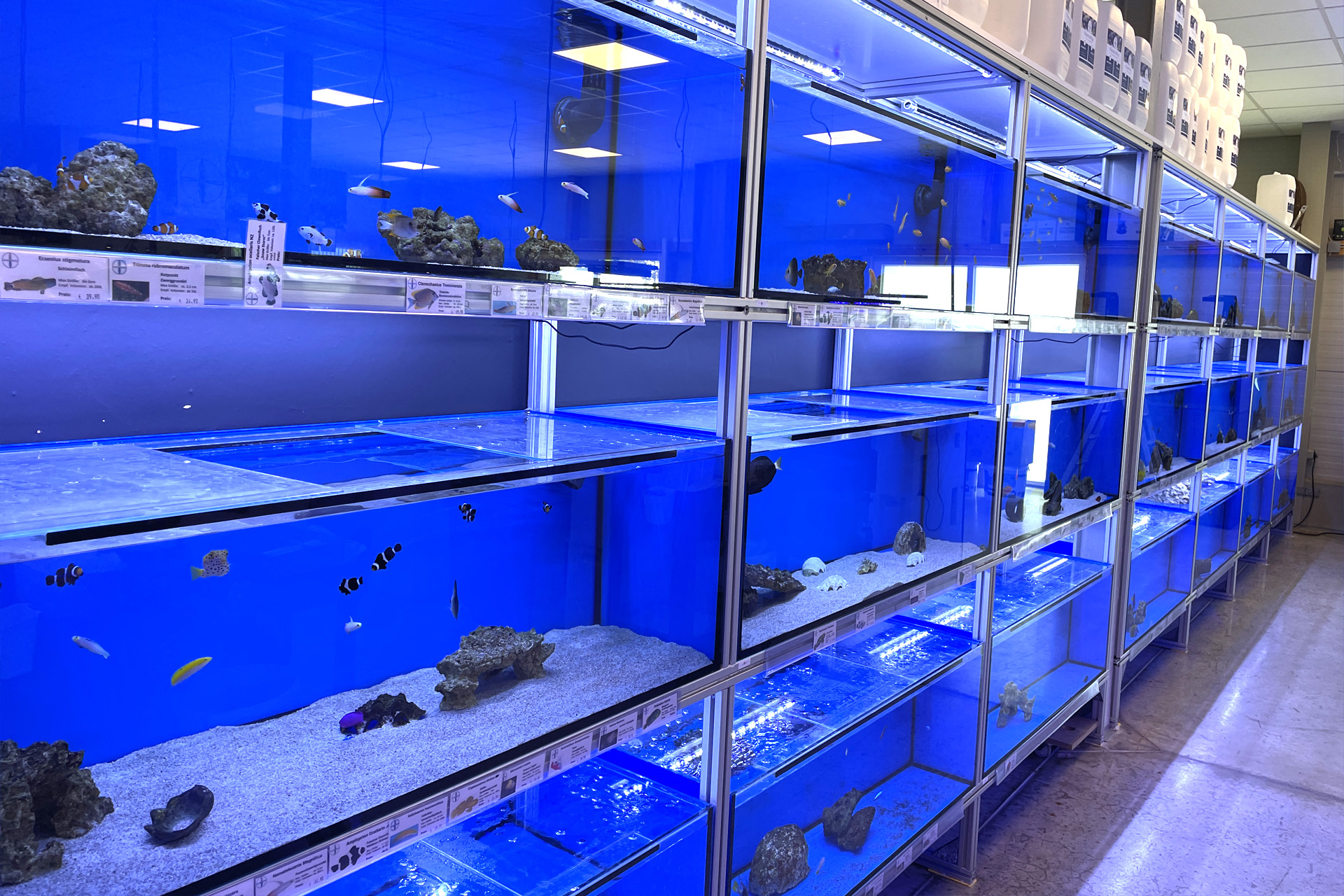 finale Umzug wird. Denn dann werden endlich Fachgeschäft und Versandhandel um selben Platz sein. Auf Einladung von Michael Schinhammer hatten wir am 10 Mai noch ein letztes Mal die Chance einen Blick in die alten Räume in Neumarkt werfen zu können. Ein letzter Blick in den Verkaufsraum, das 5-Meter-Becken und die Verkaufsanlagen, bevor alles nach Hohenburg umzieht. Parallel war ja die Herrichtung der neuen Räume schon in vollem Gange. Alles was neu zu bauen war oder nicht unbedingt für das bestehende Geschäft benötigt wurde, war bereits mitten im Umzug. Vielen Dank auf jeden Fall an Michael, dass er sich die Zeit genommen hat für einen sehr angenehmen Aufenthalt bei PlanktonPlus und für den Gedankenaustausch zu den bestehenden und der Gestaltung der neuen Räume. Hier jetzt für euch noch einmal letzte Eindrücke aus den alten Räumen Im Zwiesel 1 in Neumarkt. Imk Zentrum stehr die große Korallenanlage. An der großen Fensterseite einige Systemaquarien zur Ansicht. An den gegenüberliegenden Seiten zum Eingang befand sich zum einen die Fischanlage und zum anderen das große 5-Meter-Becken. Wenn man vom Eingang am Verkaufstresen vorbei geht, kann man sich einen guten Überblick über das Trockensortiment verschaffen.