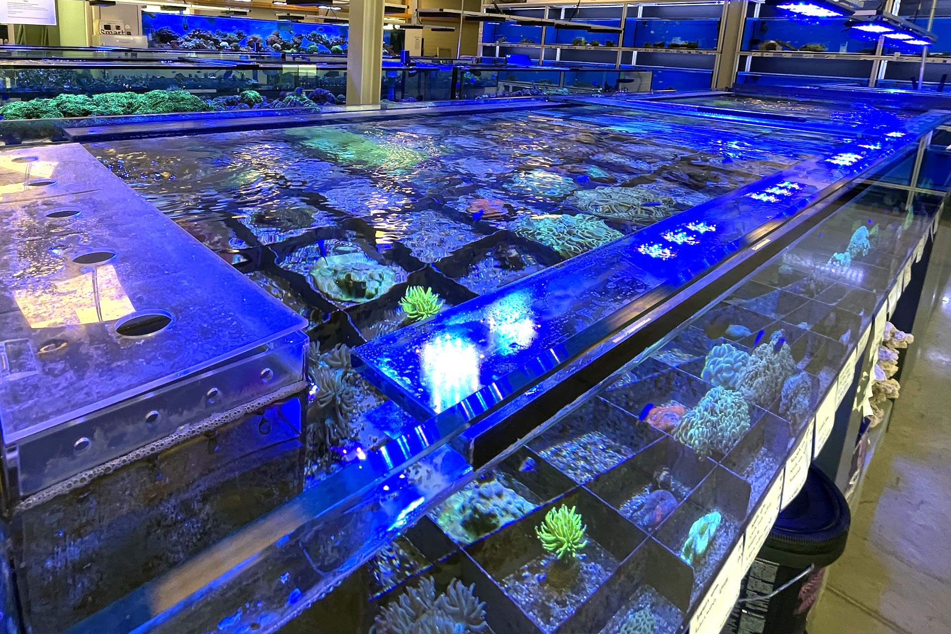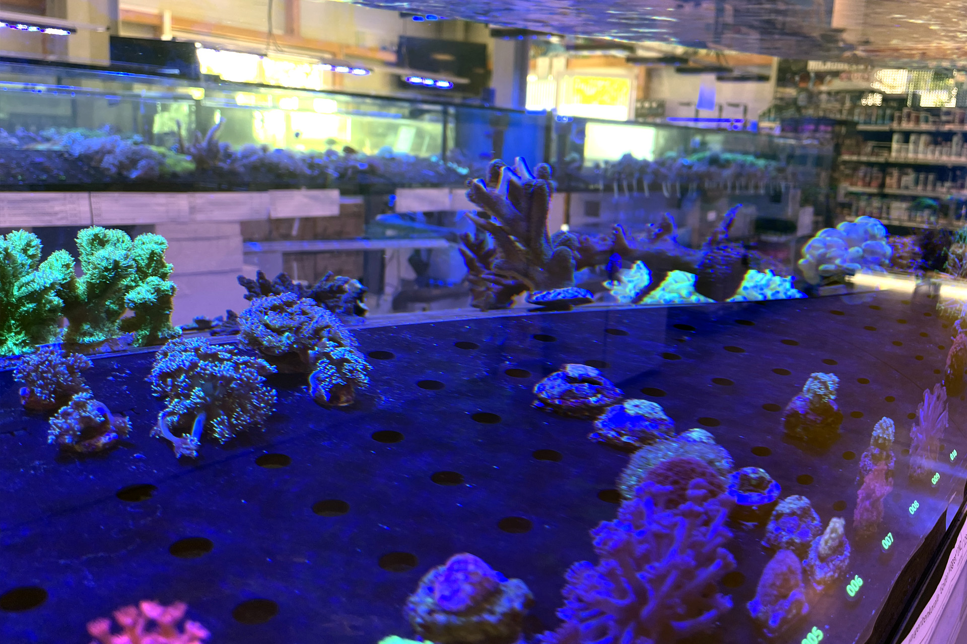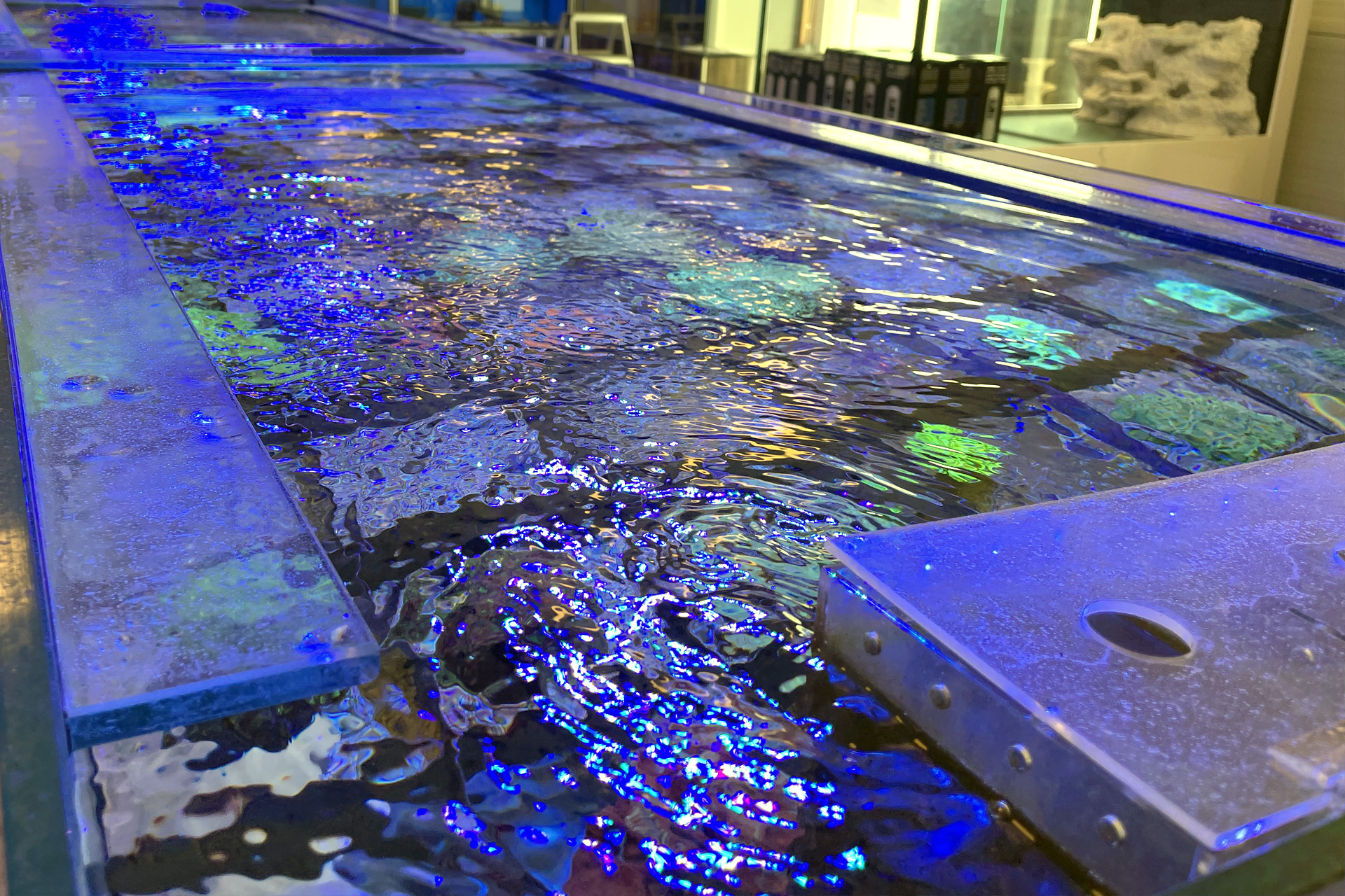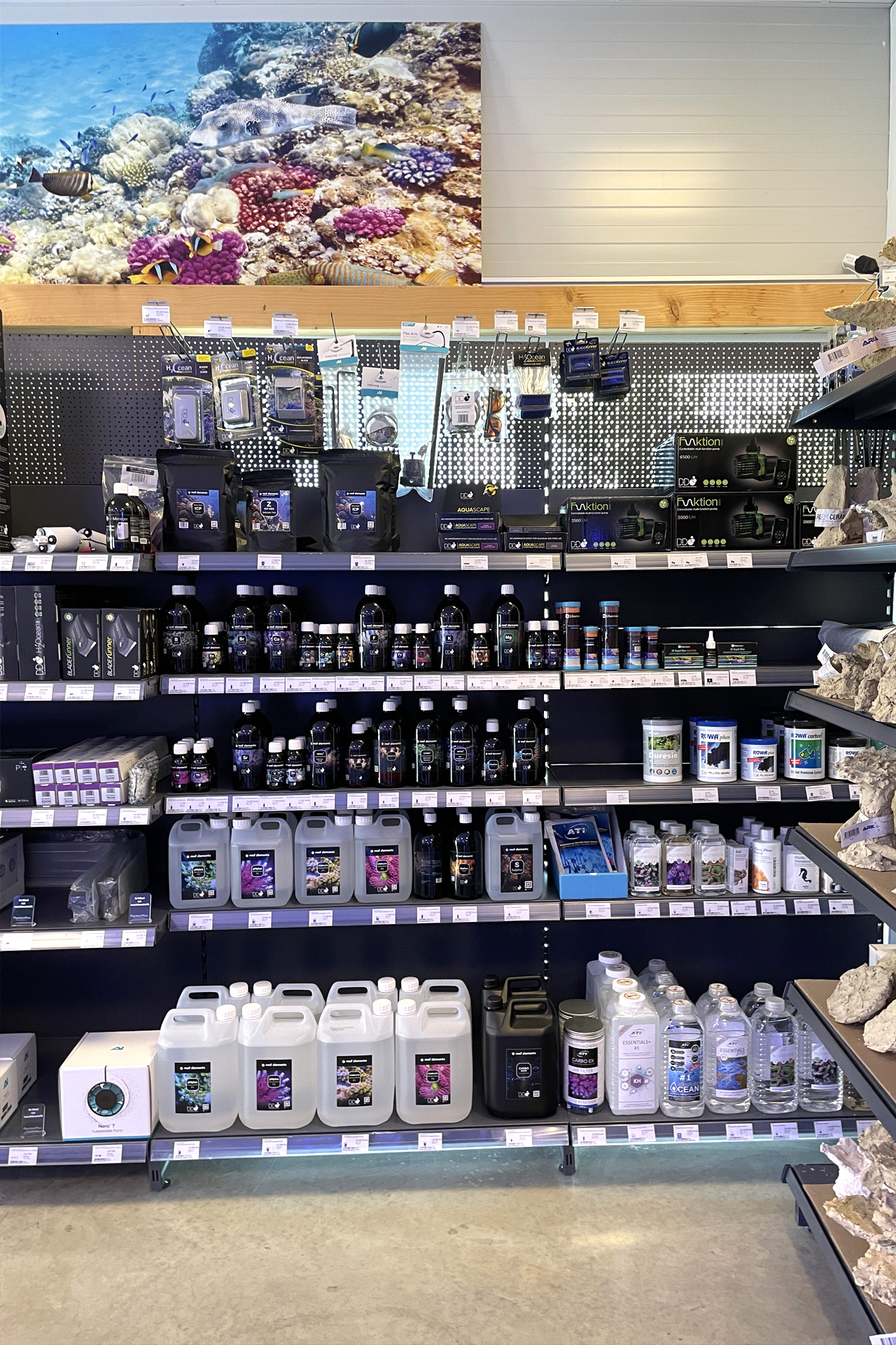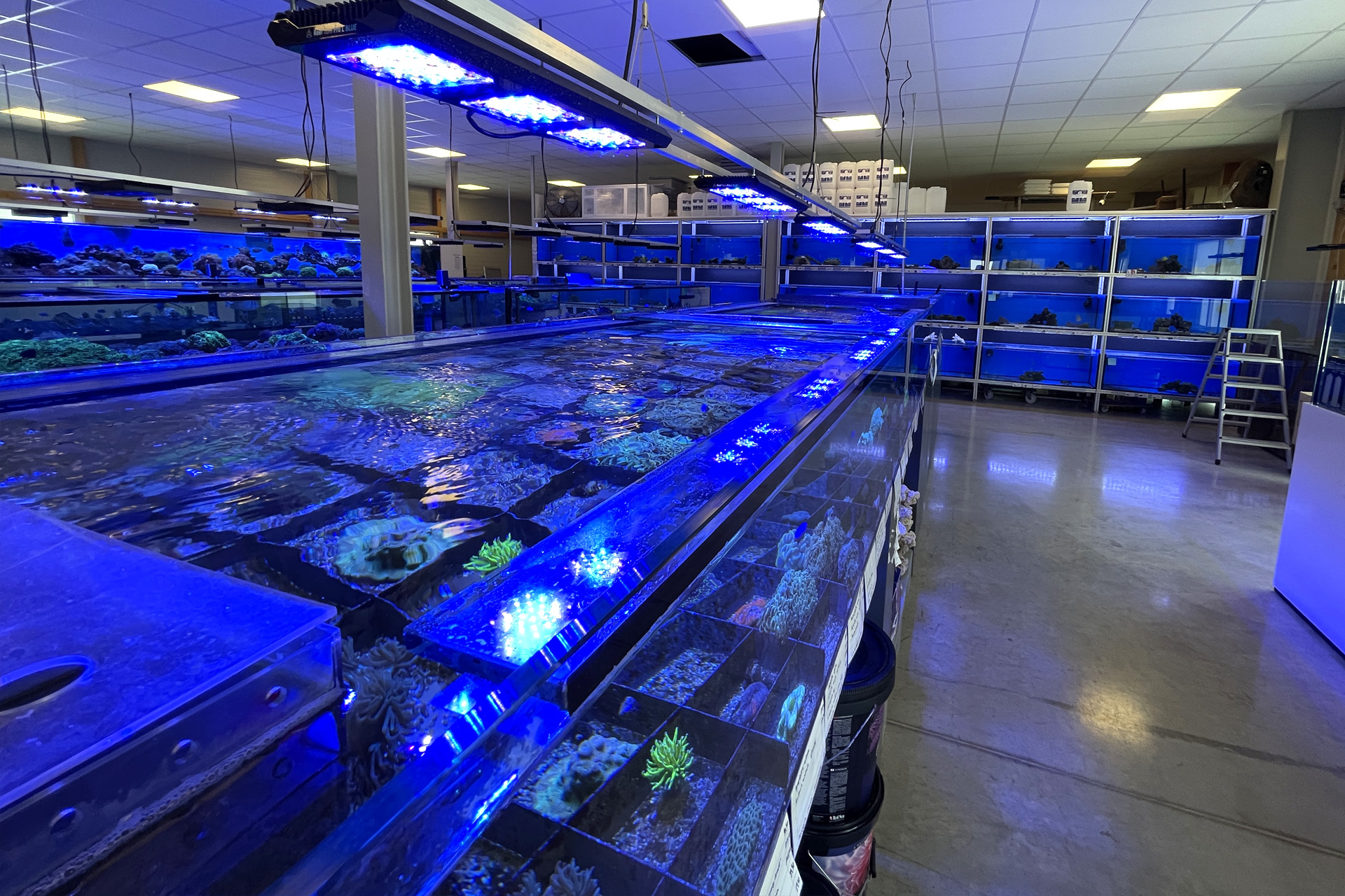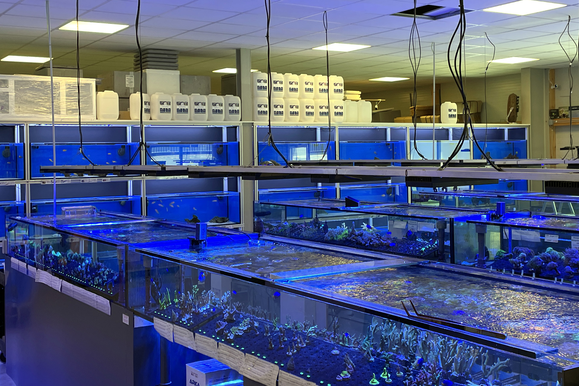 finale Umzug wird. Denn dann werden endlich Fachgeschäft und Versandhandel um selben Platz sein. Auf Einladung von Michael Schinhammer hatten wir am 10 Mai noch ein letztes Mal die Chance einen Blick in die alten Räume in Neumarkt werfen zu können. Ein letzter Blick in den Verkaufsraum, das 5-Meter-Becken und die Verkaufsanlagen, bevor alles nach Hohenburg umzieht. Parallel war ja die Herrichtung der neuen Räume schon in vollem Gange. Alles was neu zu bauen war oder nicht unbedingt für das bestehende Geschäft benötigt wurde, war bereits mitten im Umzug. Vielen Dank auf jeden Fall an Michael, dass er sich die Zeit genommen hat für einen sehr angenehmen Aufenthalt bei PlanktonPlus und für den Gedankenaustausch zu den bestehenden und der Gestaltung der neuen Räume. Hier jetzt für euch noch einmal letzte Eindrücke aus den alten Räumen Im Zwiesel 1 in Neumarkt. Imk Zentrum stehr die große Korallenanlage. An der großen Fensterseite einige Systemaquarien zur Ansicht. An den gegenüberliegenden Seiten zum Eingang befand sich zum einen die Fischanlage und zum anderen das große 5-Meter-Becken. Wenn man vom Eingang am Verkaufstresen vorbei geht, kann man sich einen guten Überblick über das Trockensortiment verschaffen.
