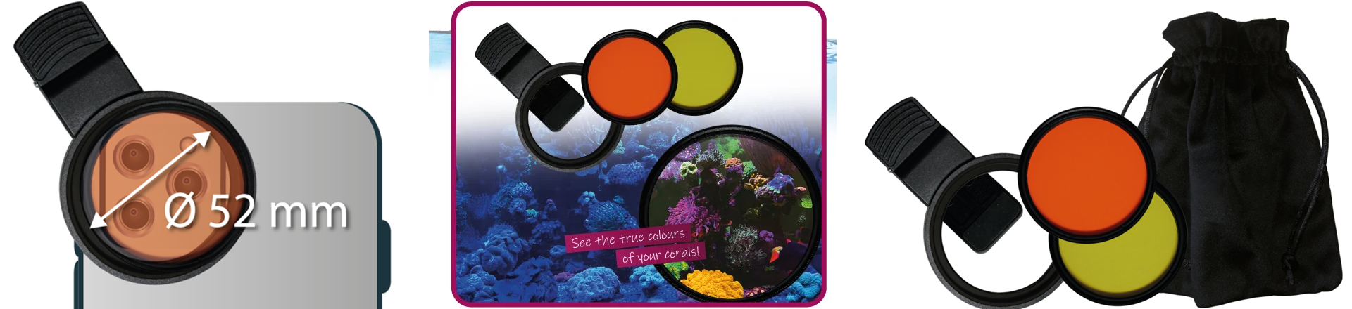 zu bringen, dass bei Fotos von Meerwasseraquarium mit dem eigenen Smartphone hilft. Dabei kann natürlich auch Aqua Medic diesem Trend nicht nachstehen. Das Paket besteht aus einem Clip und zwei Linsen, die sich in die Halterung einsetzen lassen. Mit einem Durchmesser von 52mm sind die Linsen auch ausreichend groß für aktuelle Smartphones. Es wird je ein Orangefilter (für die Blaulichtphase) und ein Gelbfilter (für Daylightaufnahmen) mitgeliefert. Damit sollte die Phosphoreszenz der Korallen ohne viel Bearbeitung deutlich auf den Aufnahmen zu sehen sein. Wir wünschen viel Spaß beim Fotografieren!