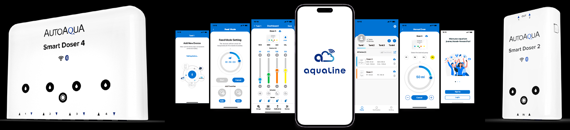 für eine Dosierpumpe auf den Markt. Als 2- oder 4-Kanal-Lösung kommt hier ein wares „Slim Line“ Gerät auf den Markt, die einfach an den Rand des Aquariums oder des Technikbeckens gehängt werden kann. Die Dosierpumpe trägt gerade mal 35mm auf. Die Schlauchanschlüsse sind Standart 1/4 Zoll Push-Verbindungen. Die Pumpen können entweder über Wifi oder Bluetooth mit einem mobilen Endgerät verbunden werden. Gesteuert wird das ganze dann mit der AquaLine App. Im Paket ist sowohl eine Wandhalterung als auch die angesprochene HangOn-Halterung für die Montage direkt am Becken enthalten. Auch Schläuche, sowie 1/4 Zoll Quick-Connect Elbows sind mit dabei. Dazu kommt noch das 12 Volt Netzteil und natürlich die stylische Dosierpumpe selbst.