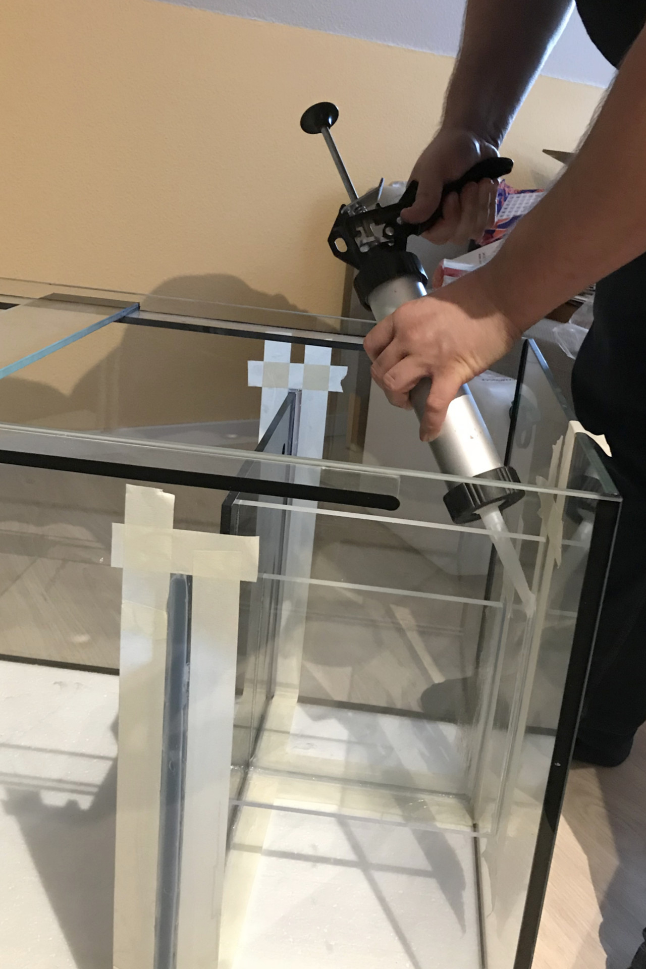 Letzendlich konnten wir es dann doch nicht mehr abwarten und haben beschlossen, dass jetzt genug Zeit zum Durchtrocknen vergangen war. So haben wir uns dann im Silikonieren probiert. Klar, wir sind beide nicht gerade Profis im Umgang mit Acrylkleber und Silikon (eher das Gegenteil). Gerade wenn man das beachtet, ist das Ergebnis unserer Arbeit echt gut gelungen. Jetzt freuen wir uns schon darauf, dass es weiter geht.