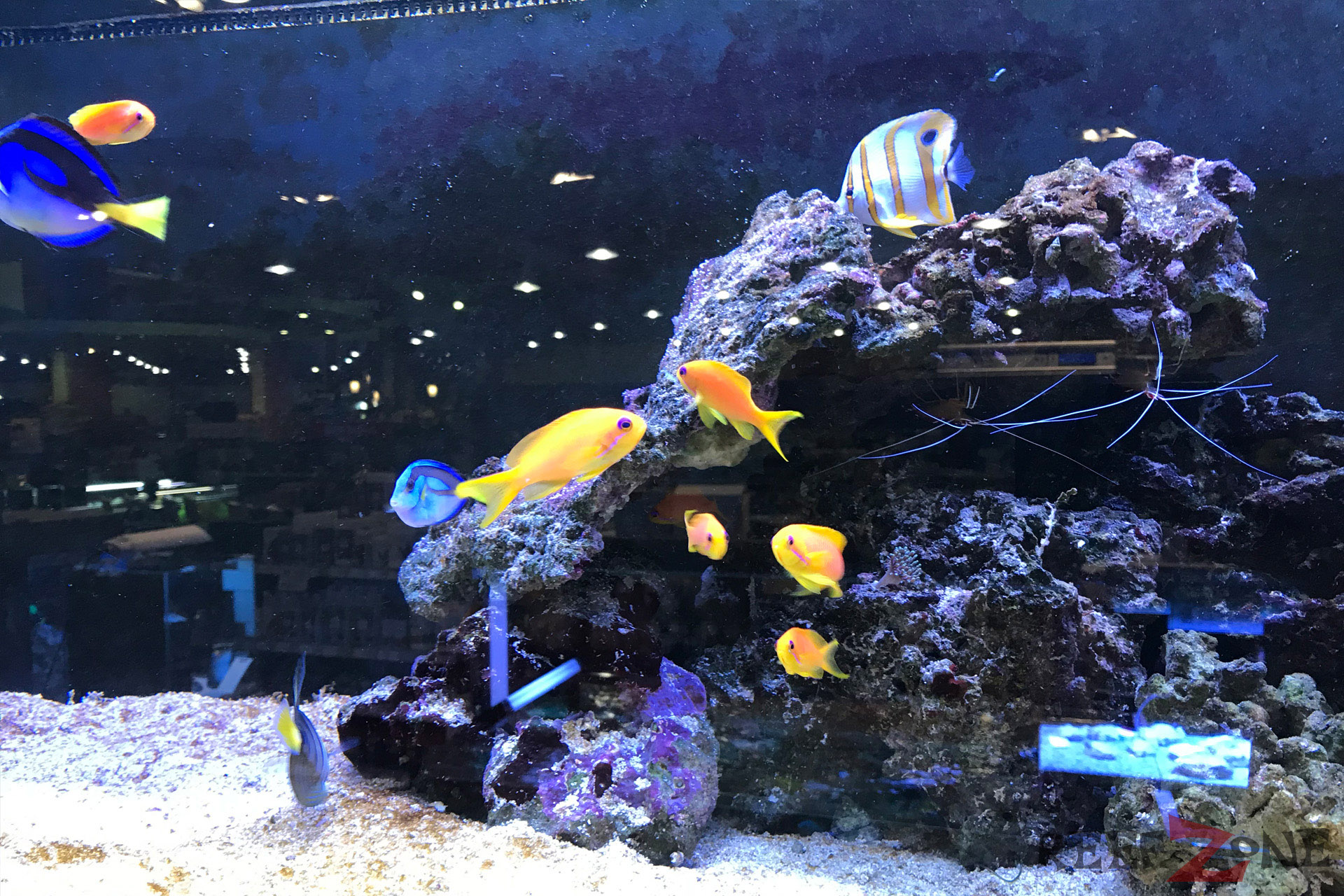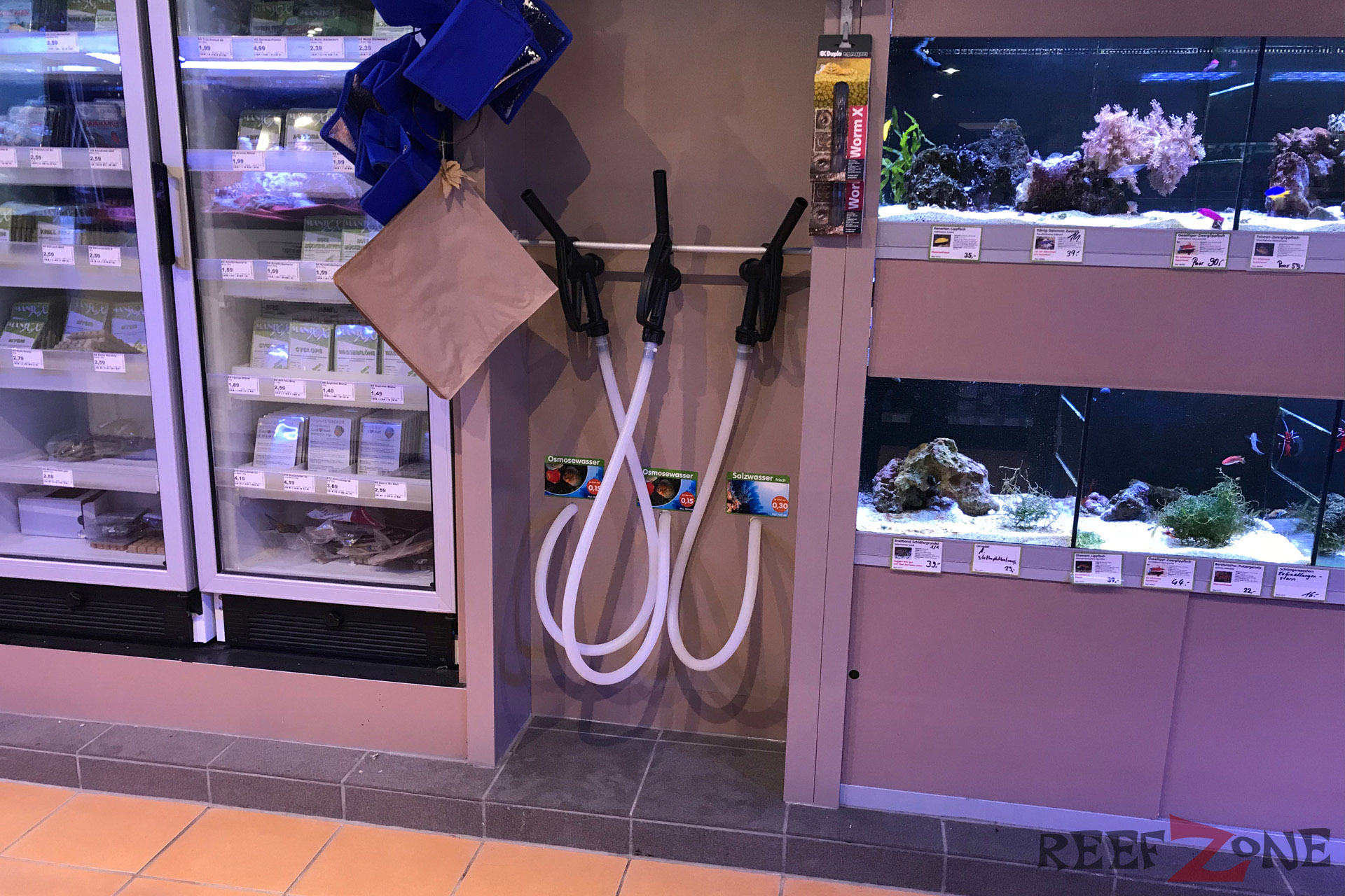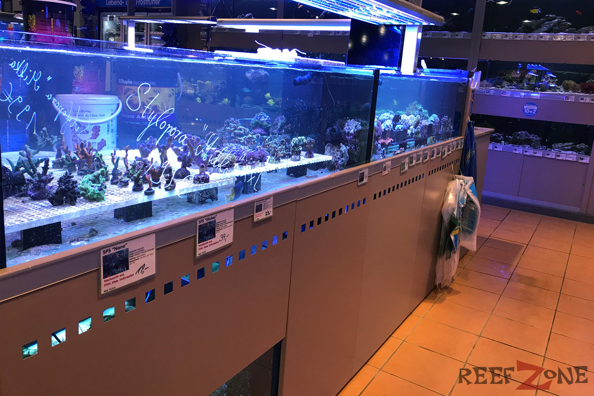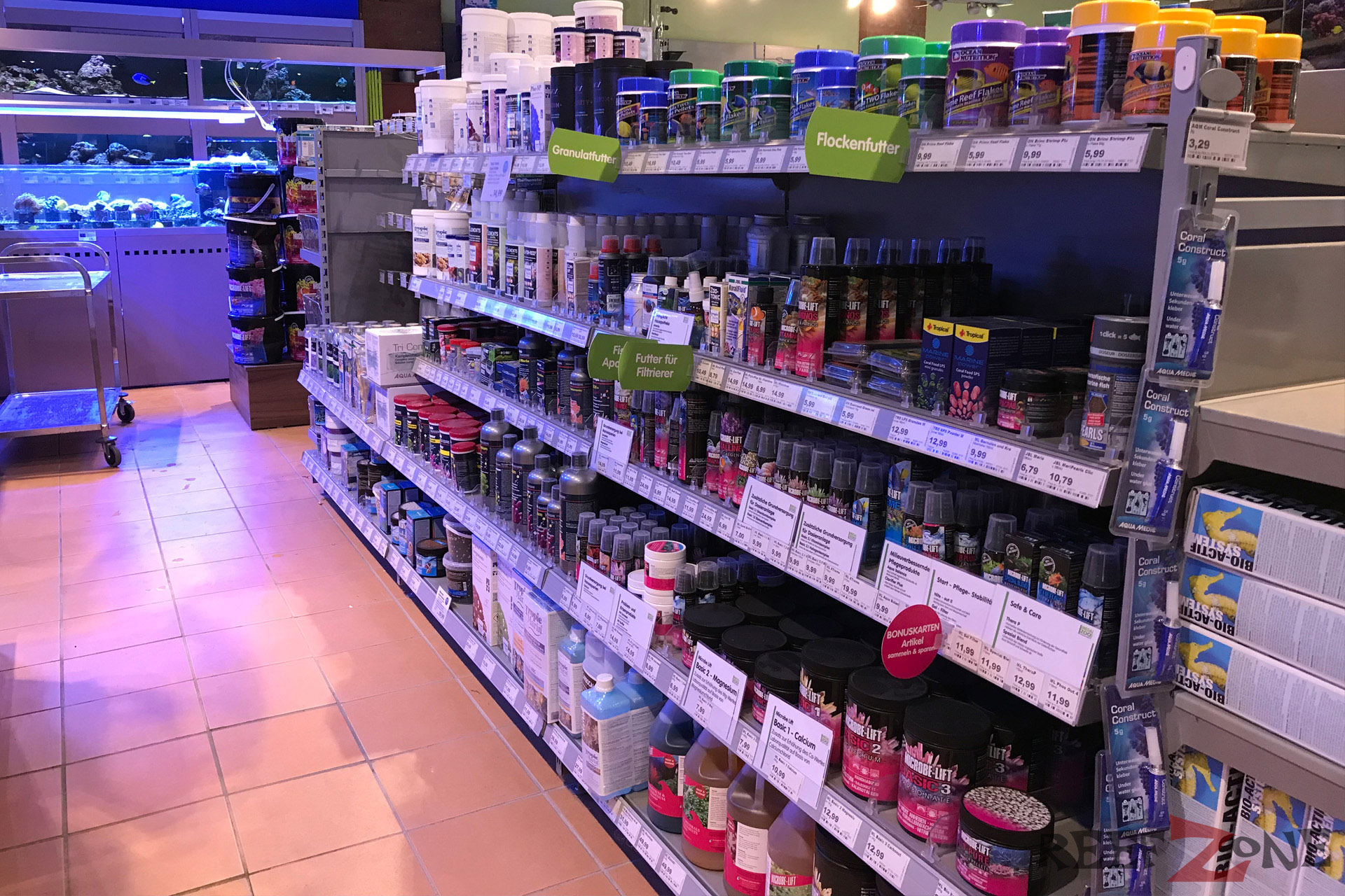 Aktuell befindet sich ab Platz der ehemaligen Meerwasserabteilung eine Aquarienausstellung. Dafür gehen jetzt Meerwasser- und Süßwasserabteilung förmlich ineinander über. Passt irgendwie auch besser. Zahlreiche Becken mit Riffbewohnern sind jetzt in L-Form entlang der Wand aufgebaut. Daneben stehen Korallenanlagen unter denen sich Filterbecken mit Lebendgestein befinden. Zahlreiches Zubehör, künstliches Riffgestein, totes Riffgestein und Technik gehören zum Sortiment. In den Korallenbecke schwimmen zahlreiche Fische, darunter Doktoren und Riffbarsche. Auch an einer Tankstelle für Meerwasser fehlt es hier nicht.