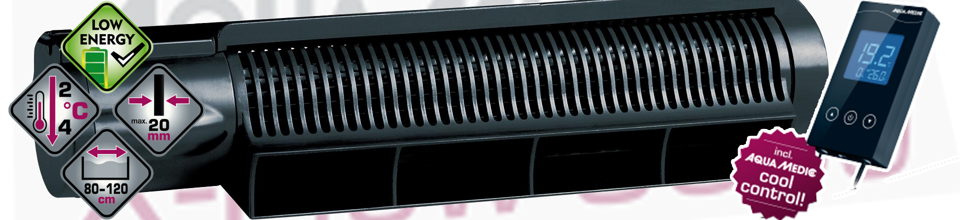 ...auf die nächste Hitzewelle vorzubereiten. Aqua Medic bringt uns dafür jetzt einen neuen, kompakten Querstromventilator für unsere Aquarien auf den Markt. Die Temperatursteuerung bringt er gleich mit und ist bequem am Beckenrand zu befestigen. Vom Hersteller ist er für Aquarien bis 500Litern angegeben. Wie bei der Belüftung der Wasseroberfläche bekannt, kann das Wasser dadurch ein paar grad durch die auftretende Verdunstungskälte heruntergekühlt werden. Üblicherweise ist hier von 2 bis 4 Grad Celsius die Rede. Besonders angenehm ist hier die 12V Stromversorgung und der niedrige Stromverbrauch von nur 4,2 W. Das Kabel könnte mit nur 1,5m wieder einmal gerne etwas länger sein. Mit den Abmessungen von 27 x 6,5 x 5,5 cm ein schönes kompaktes Gerät für diesen Zweck. Dazu kommt noch einmal der Controller mit Touch Display von 12 x 6,2 x 2,8 cm. Ist bei uns schonmal für den nächsten Sommer vorgemerkt!